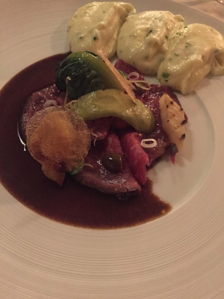 Si je devais, pour ma part, ne retenir que deux de ses mets d’exception, je citerai, tout d’abord,  son plat signature :  le bÅ“uf Simmental, maturé durant 90 jours, accompagné de son exceptionnelle purée.