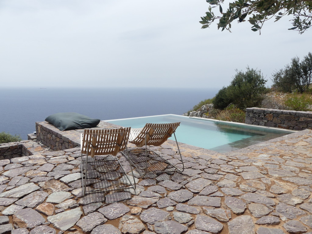 Puis pour le cadre ultra idyllique dont on jouit dans la cour, pavée de pierre et plantée d’arbres,  qui entoure la piscine à débordement faisant face à la mer.