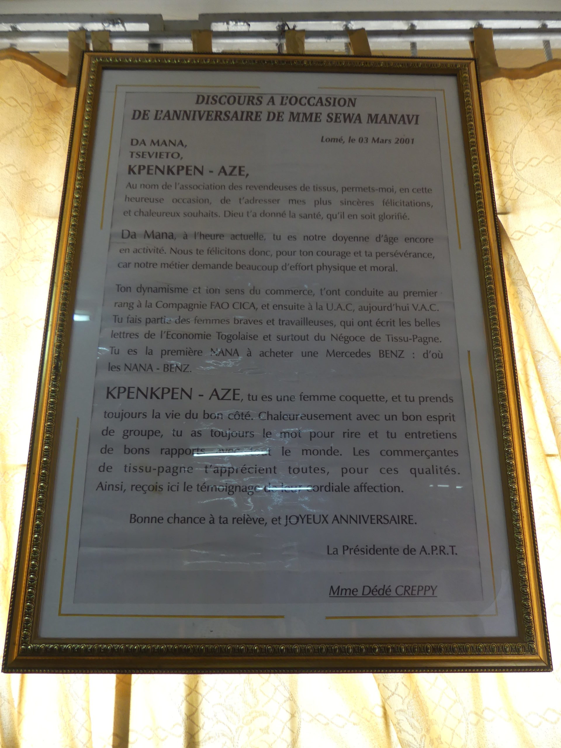 Mais la confiance que finirent par lui accorder l’UAC et la CFAO (maisons de commerce britannique et française qui détenaient alors le monopole s’agissant de l’écoulement de pagnes produits, entre autre, aux Pays Bas), en l’autorisant à exploiter des dessins exclusifs de wax hollandais (pour certains ultérieurement conçus par elle même) lui permis, à la fin des années 1960, d’obtenir un box dans le Grand Marché d’Adawlato de Lomé, lieu emblématique des Nana Benz.