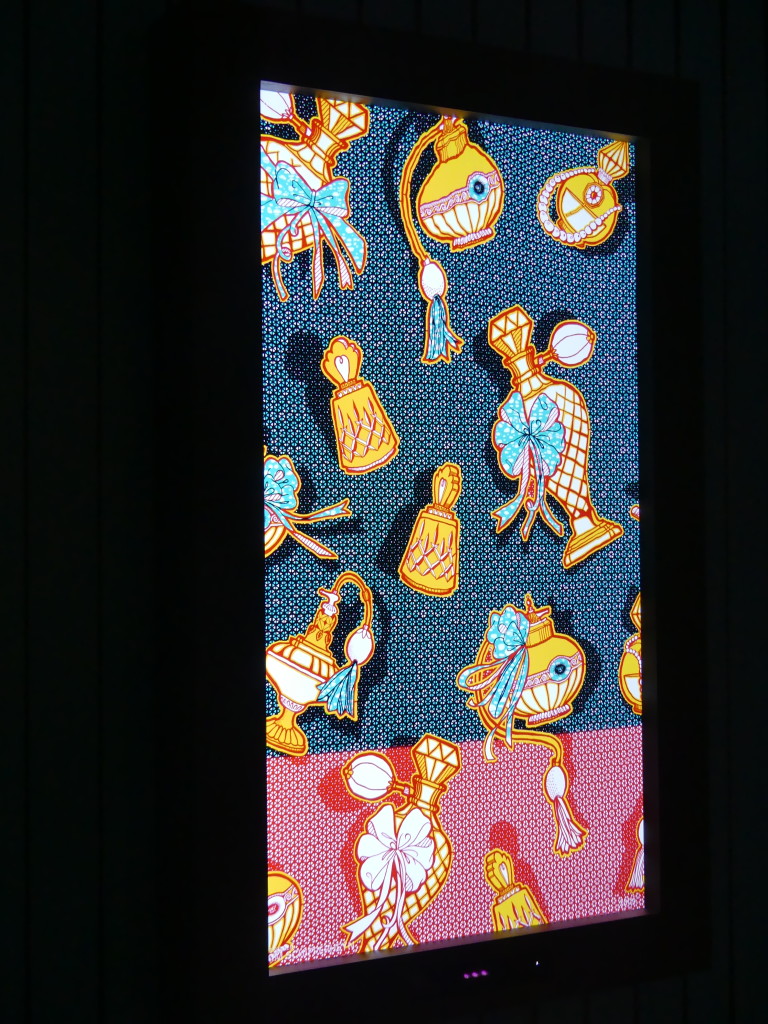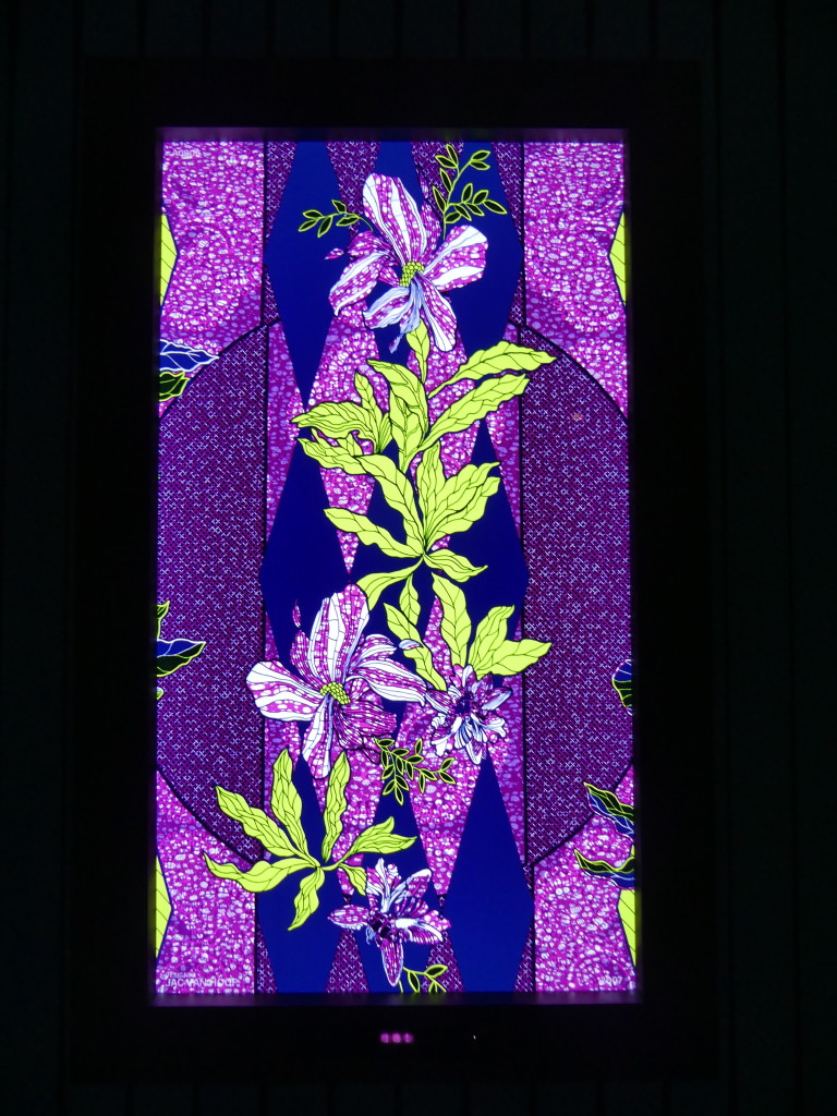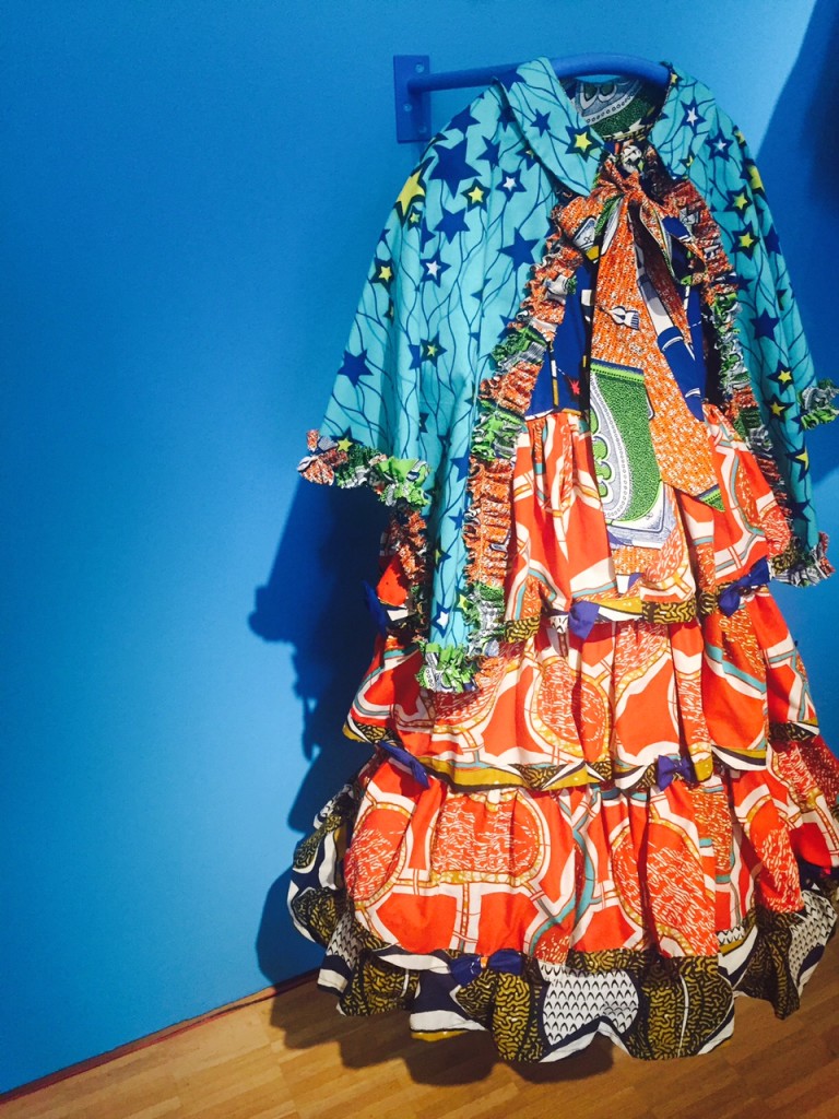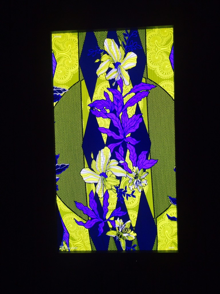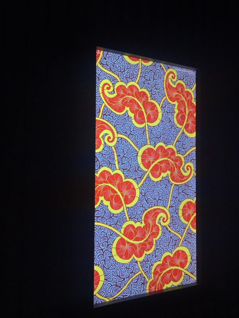La montée des marches qui séparent la salle du rez-de-chaussée de celle située au premier étage de l’édifice a ensuite assuré la transition vers la deuxième exposition qui offre, quant à elle, une facette bien plus inédite de l’utilisation des pagnes Vlisco.