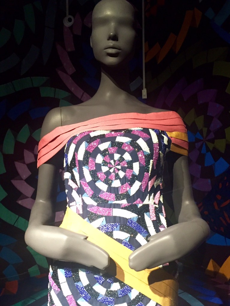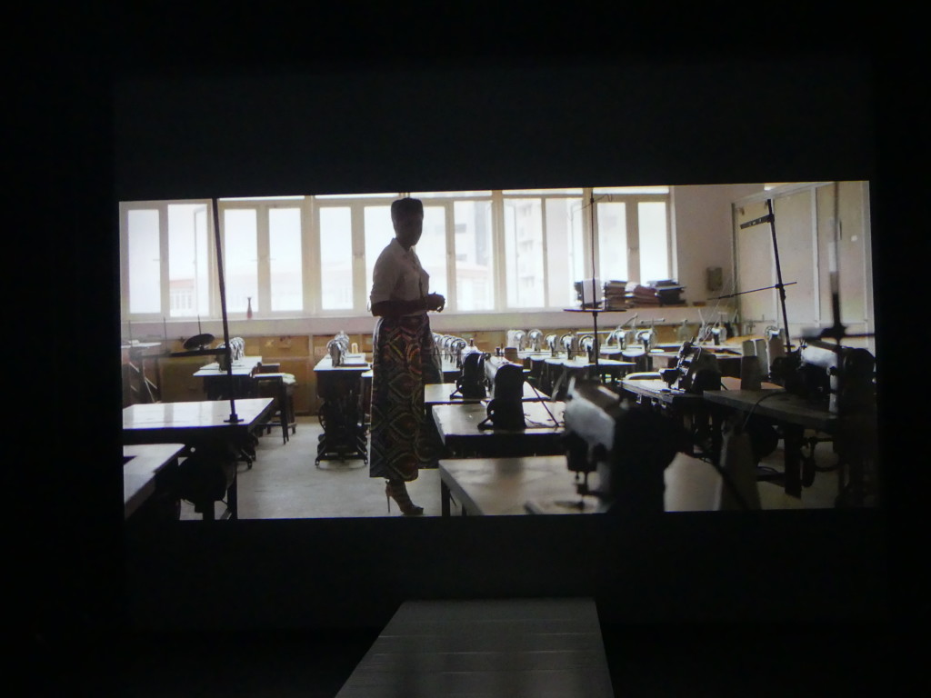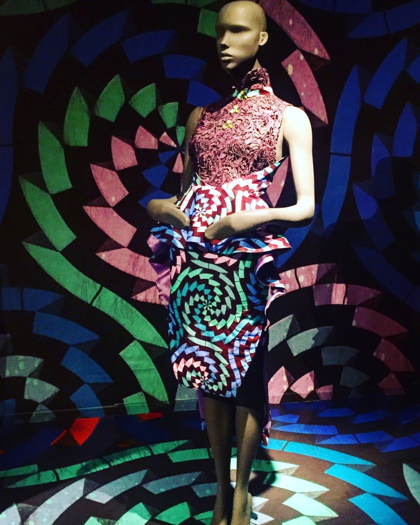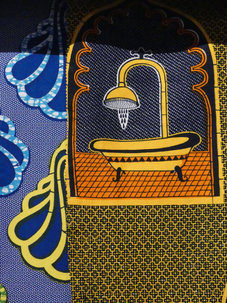 La montée des marches qui séparent la salle du rez-de-chaussée de celle située au premier étage de l’édifice a ensuite assuré la transition vers la deuxième exposition qui offre, quant à elle, une facette bien plus inédite de l’utilisation des pagnes Vlisco.