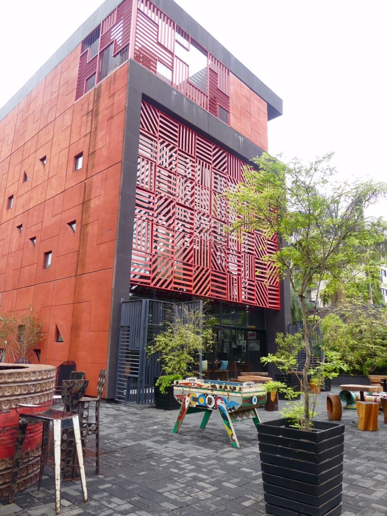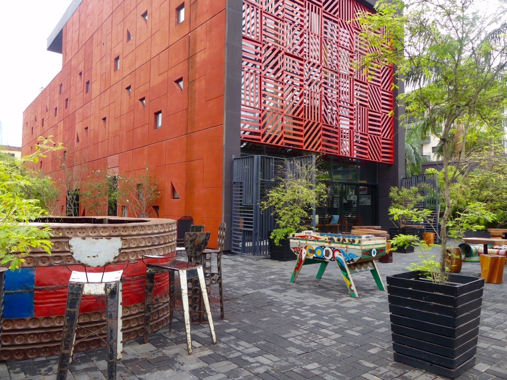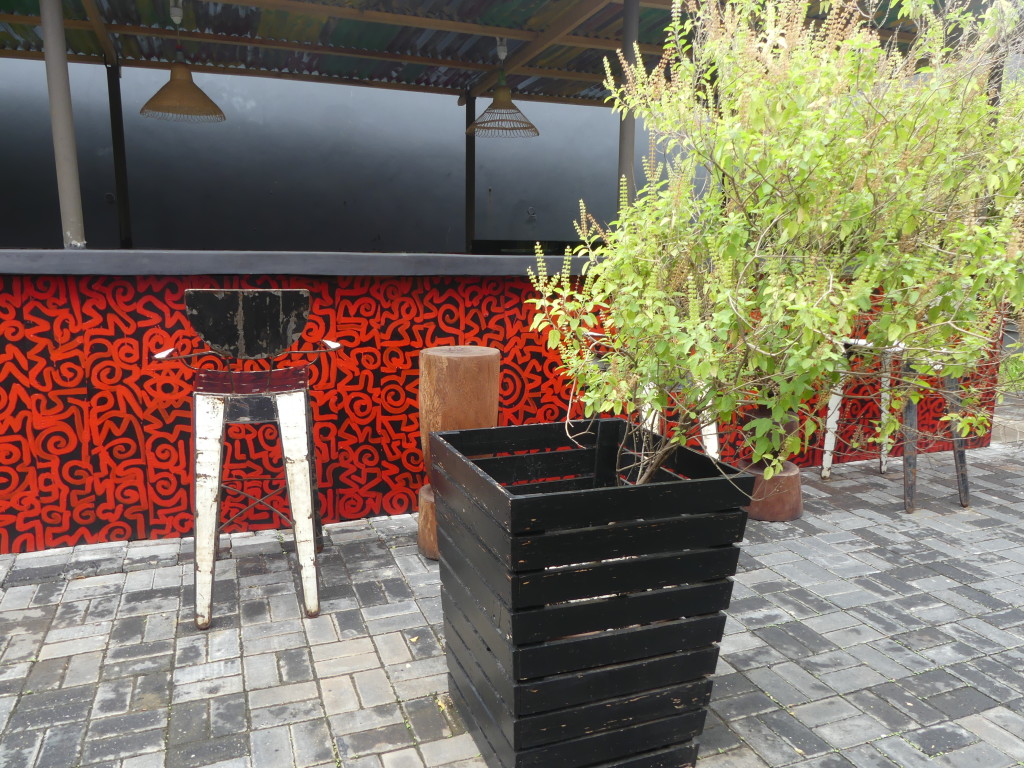 du bar extérieur recouvert d’une fresque de l’artiste nigérian Victor Ehikhamenor ;