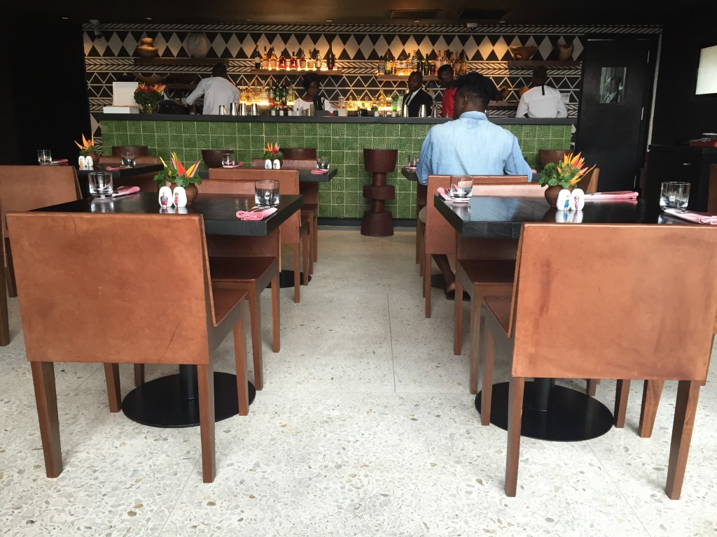 C’est donc le pas pressé que j’ai, quant à moi,  pénétré dans l’antre africaine ( la toute première sur le continent) du renommé chef sénégalais Pierre Thiam ( à la tête de nombreux et réputés restaurants à New York) où des hôtesses élégamment vêtues d’Iro et Buba (tenues traditionnelles nigérianes) réservent un accueil chaleureux à tous ceux qui passent le seuil de l’établissement.