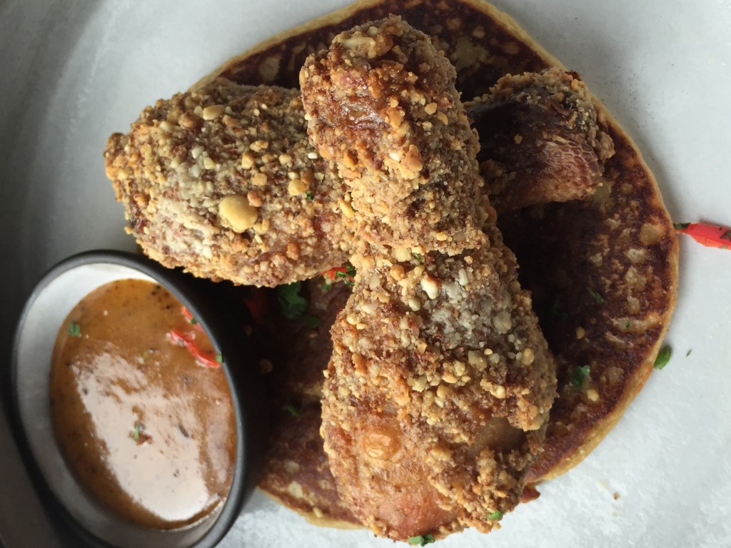 et des délicieuses et croustillantes cuisses de poulet panées servies sur une pancake à base de patate douce .