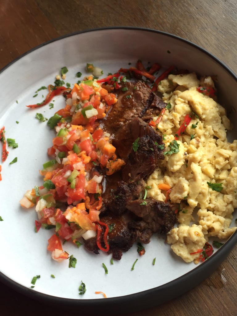des Å“ufs brouillés accompagnés d’un steak de bÅ“uf cuit façon suya (si vous n’aimez pas le piment passez votre chemin)