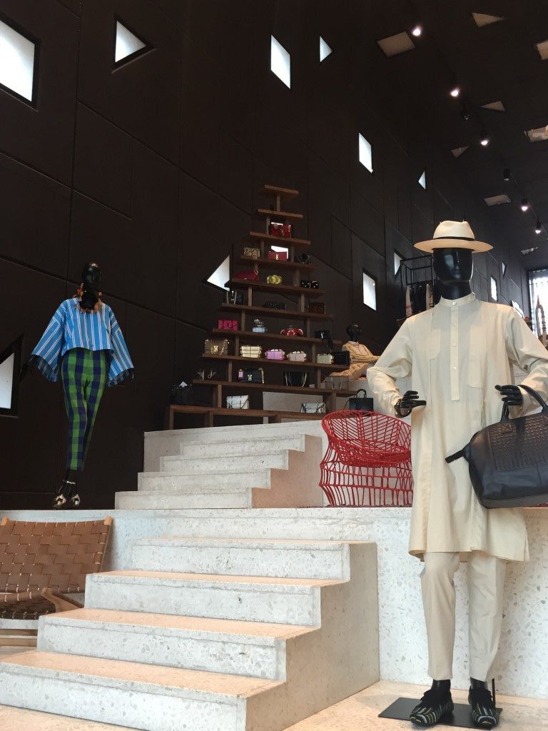 Ainsi, la montée des modulables (afin de s’adapter aux divers événements, qu’ Alara accueille) marches conduit,  sur trois étages répartis sur près de 1000 m2, à la découverte d’une sélection ( faite par Reni Folawiyo elle-même) de pièces exclusives, vendues en dollars, joliment mises en scène.