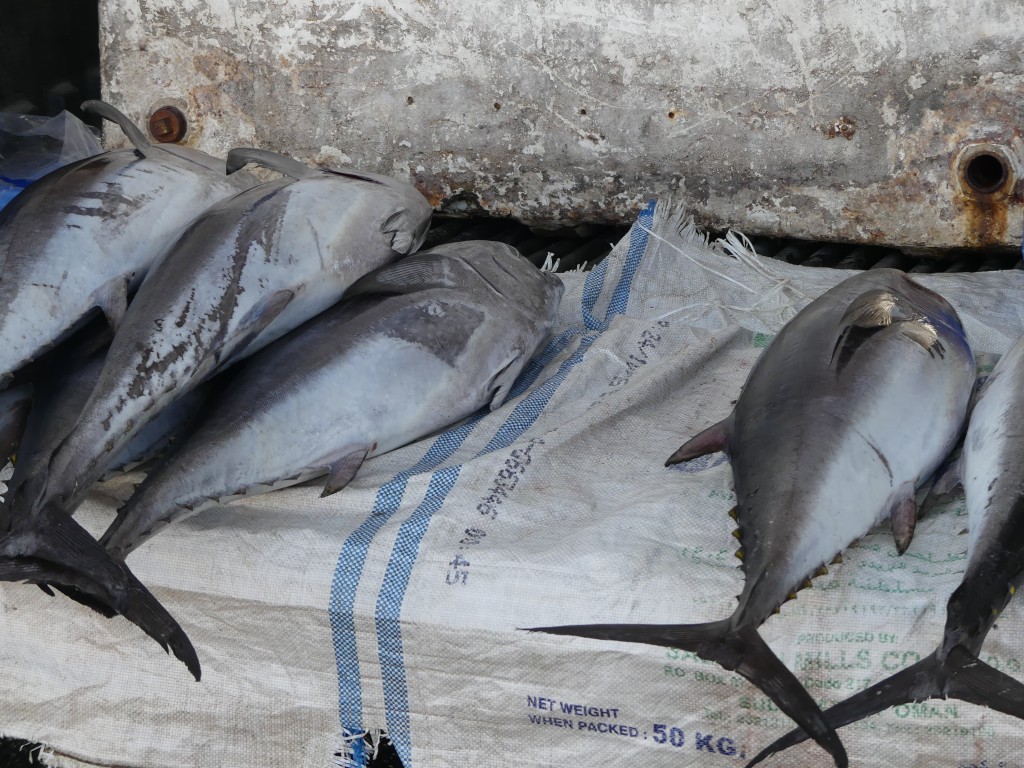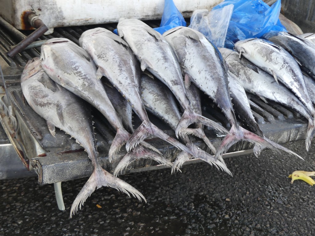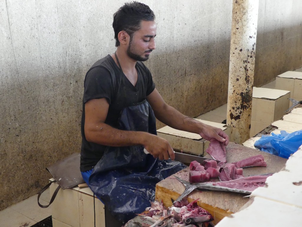 Avant de quitter le marché, dirigez vous vers le fond du hangar où plusieurs hommes, à l’époustouflante dextérité, s’assurent du service après vente en évidant, nettoyant et découpant les produits achetés par la clientèle.
