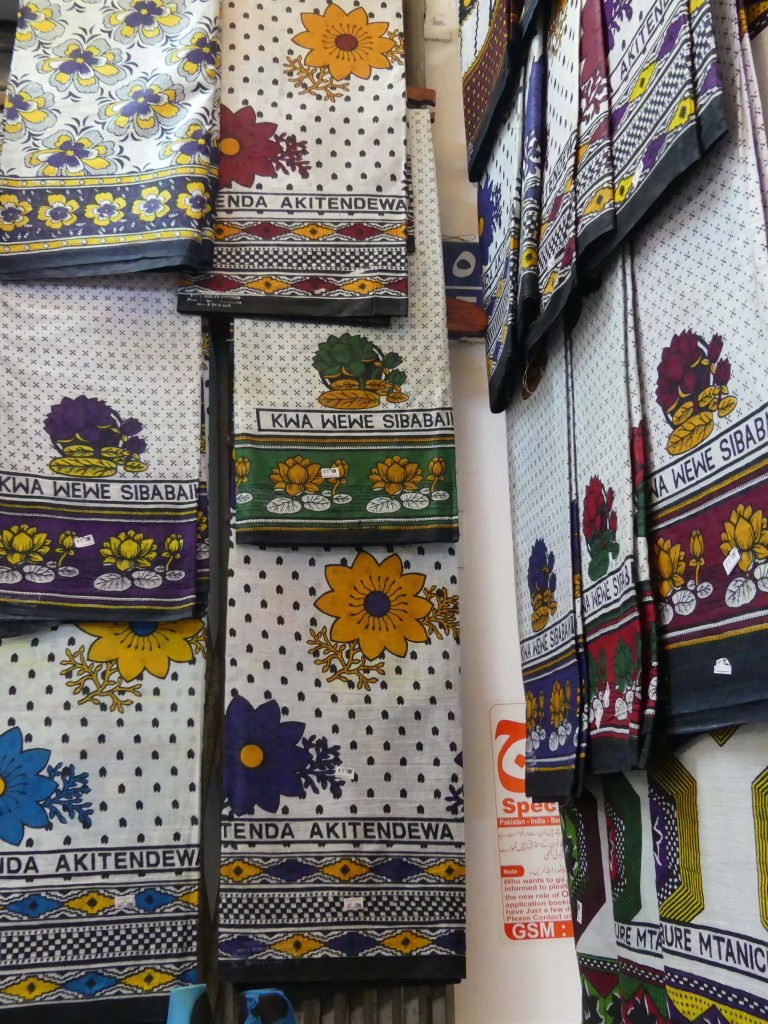 différents textiles, parmi lesquels les khangas (tissus portés notamment en Afrique de l’Est),   vêtements,