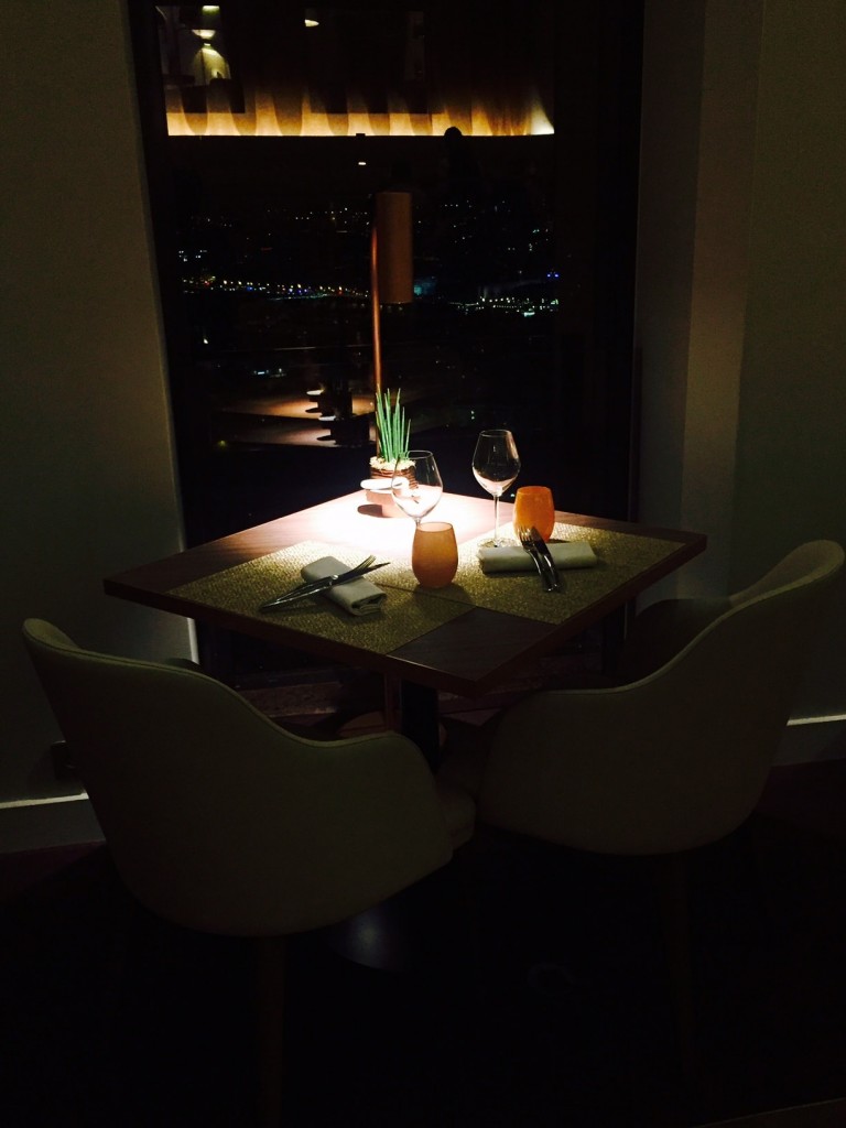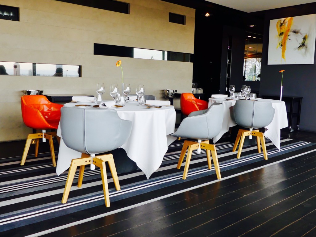 Sa salle cosy,  à la décoration contemporaine,   se déploie en effet le long de baies vitrées offrant un idyllique panorama sur la ville.