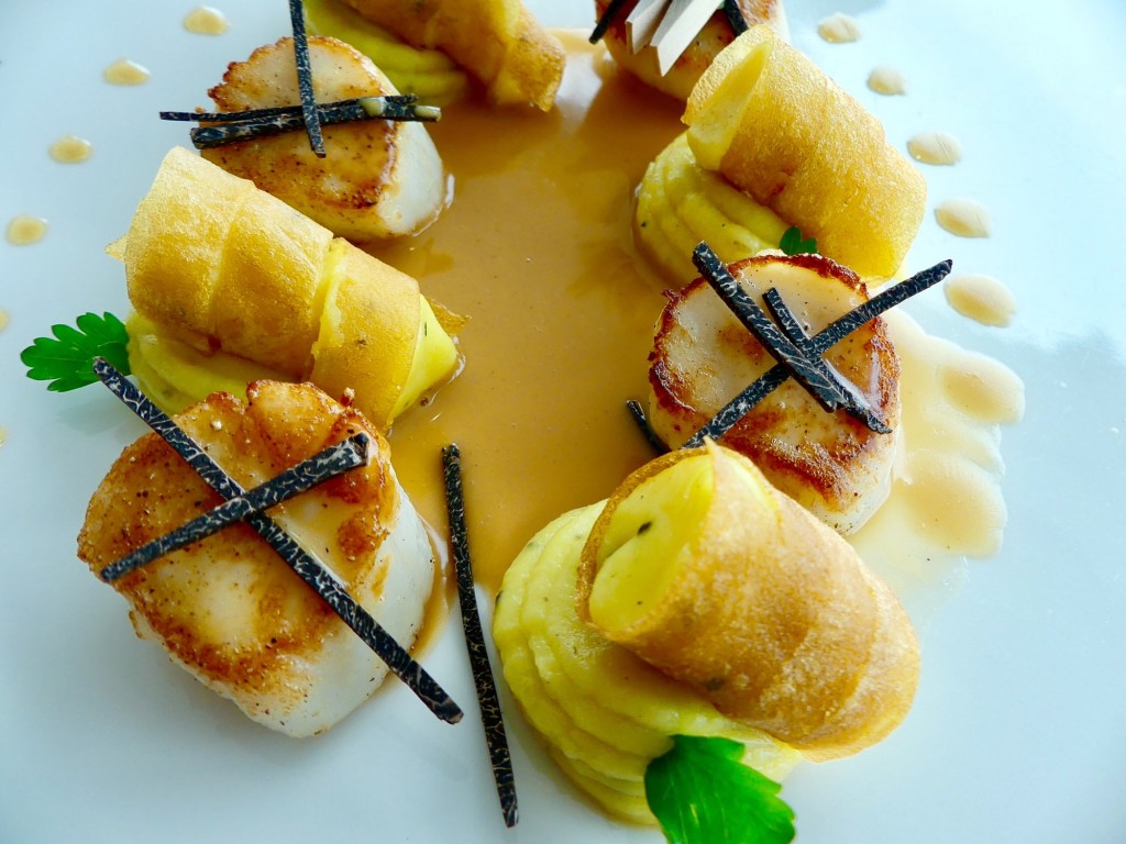 Mais également des délicieuses noix de saint jacques caramélisées, copeaux de truffe noire et onctueuse mousseline de pomme de terre dont je n’ai absolument rien laissé