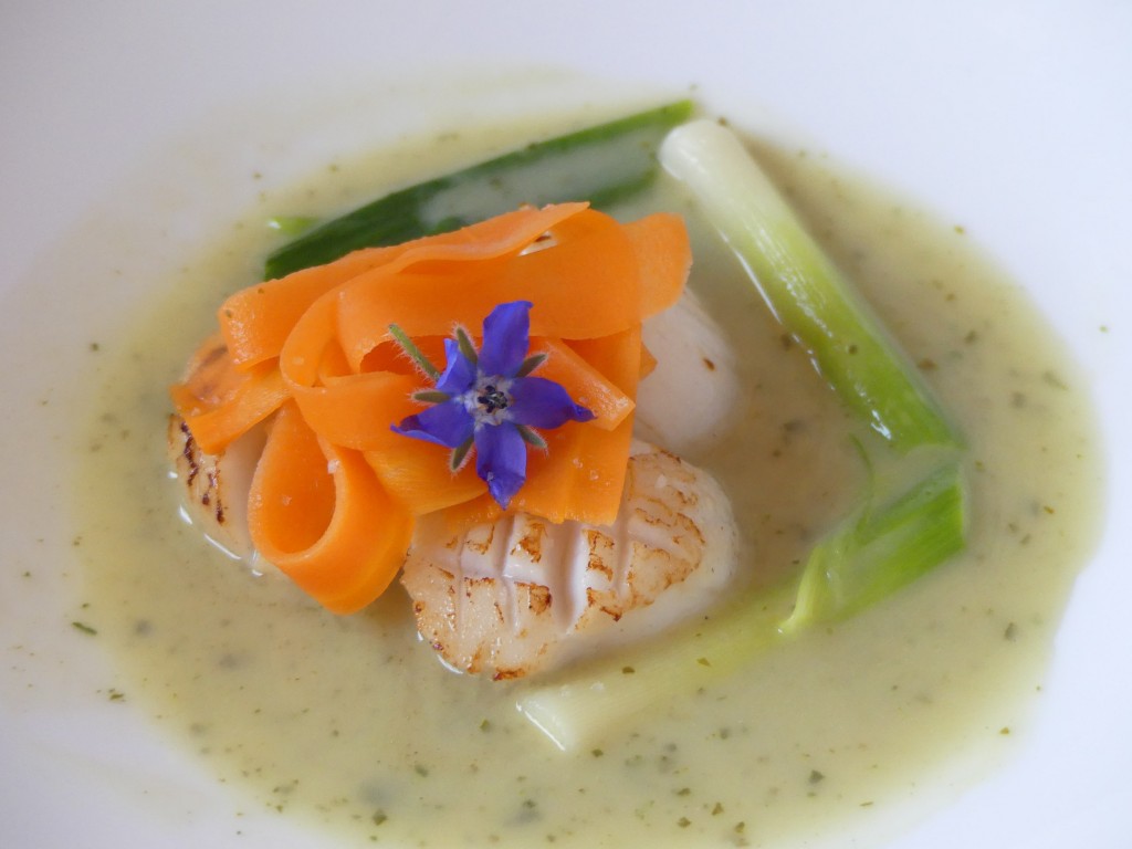 La touche asiatique apportée par le velouté de poireaux au lait de coco et au  basilic thai sublime les noix de saint jacques rôties