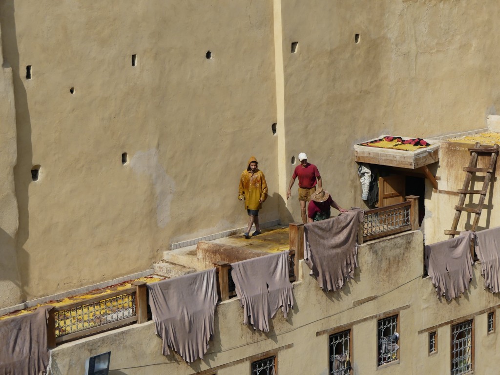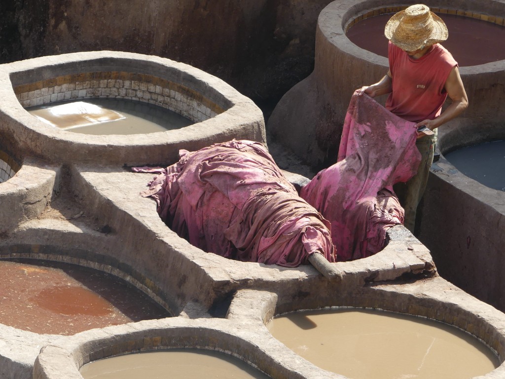 une odeur nauséabonde prend à la gorge : celle de la fiente de pigeon utilisée durant la première étape du fastidieux processus de tannage.