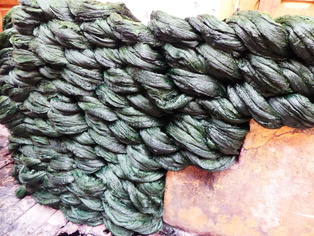 et surplombant les cuves remplies de teintes obtenues à partir de plantes naturelles,
