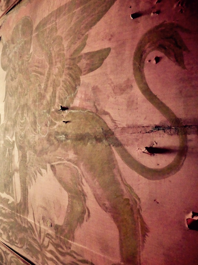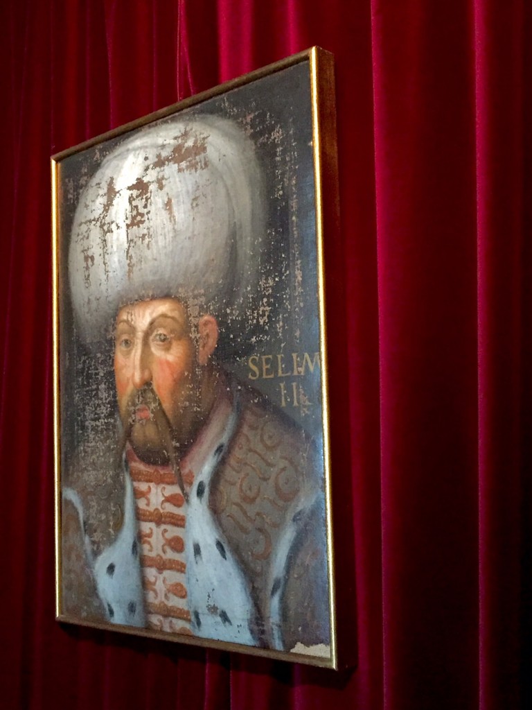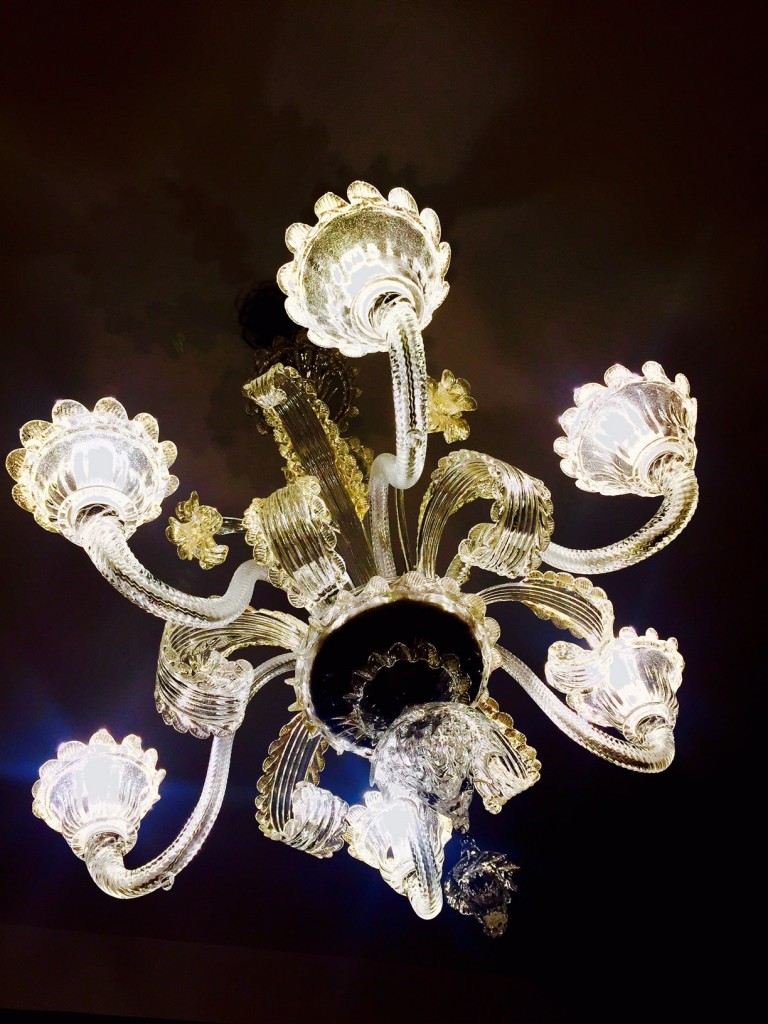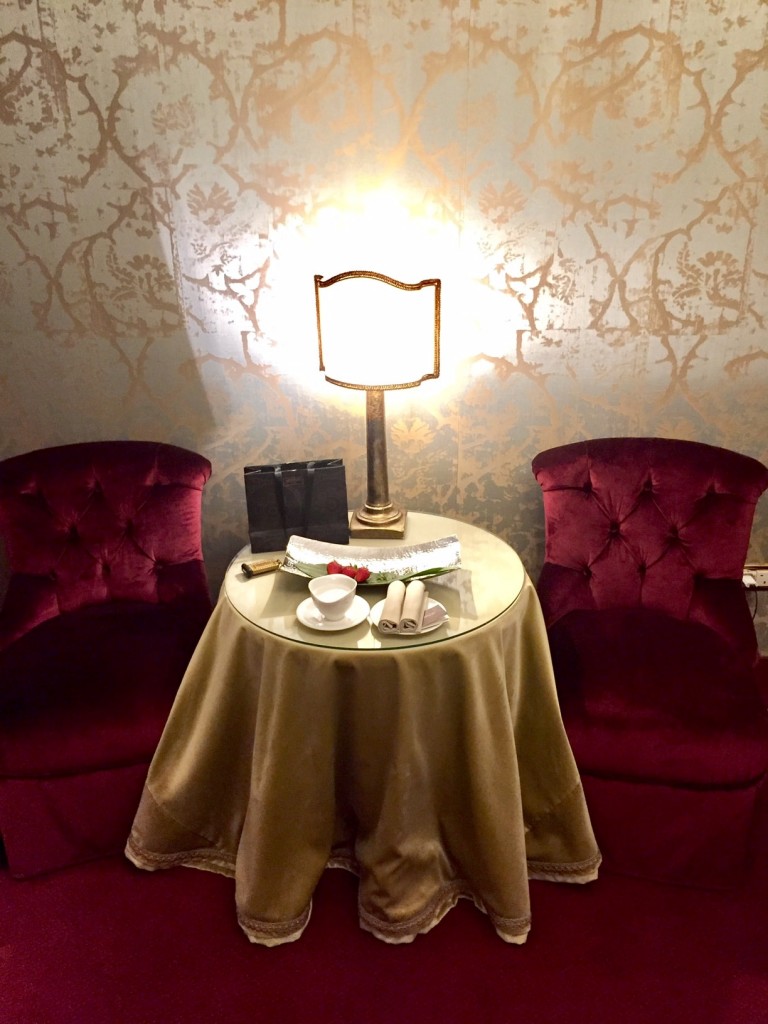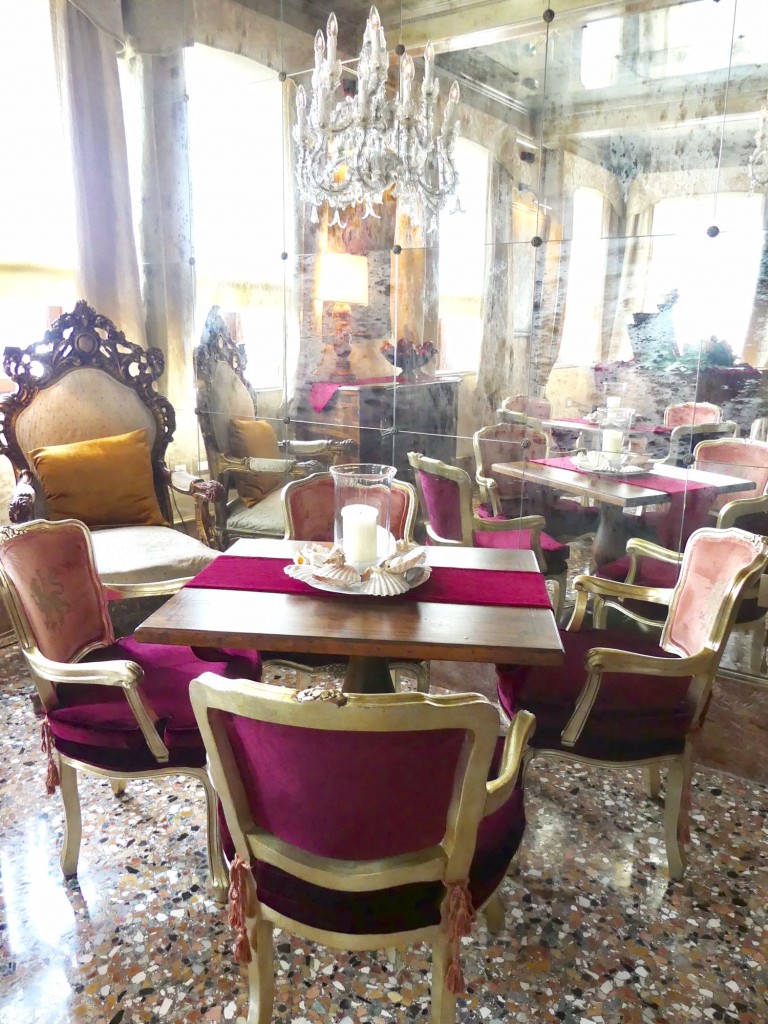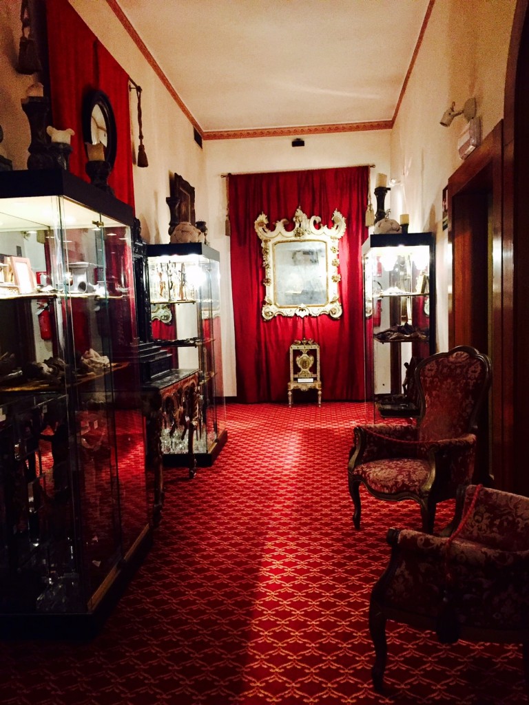 Les fauteuils en velours rouge, les tableaux, les tentures, les chandeliers en verre de Murano, les multiples bougies allumées, les coffres, les plafonds peints,Â