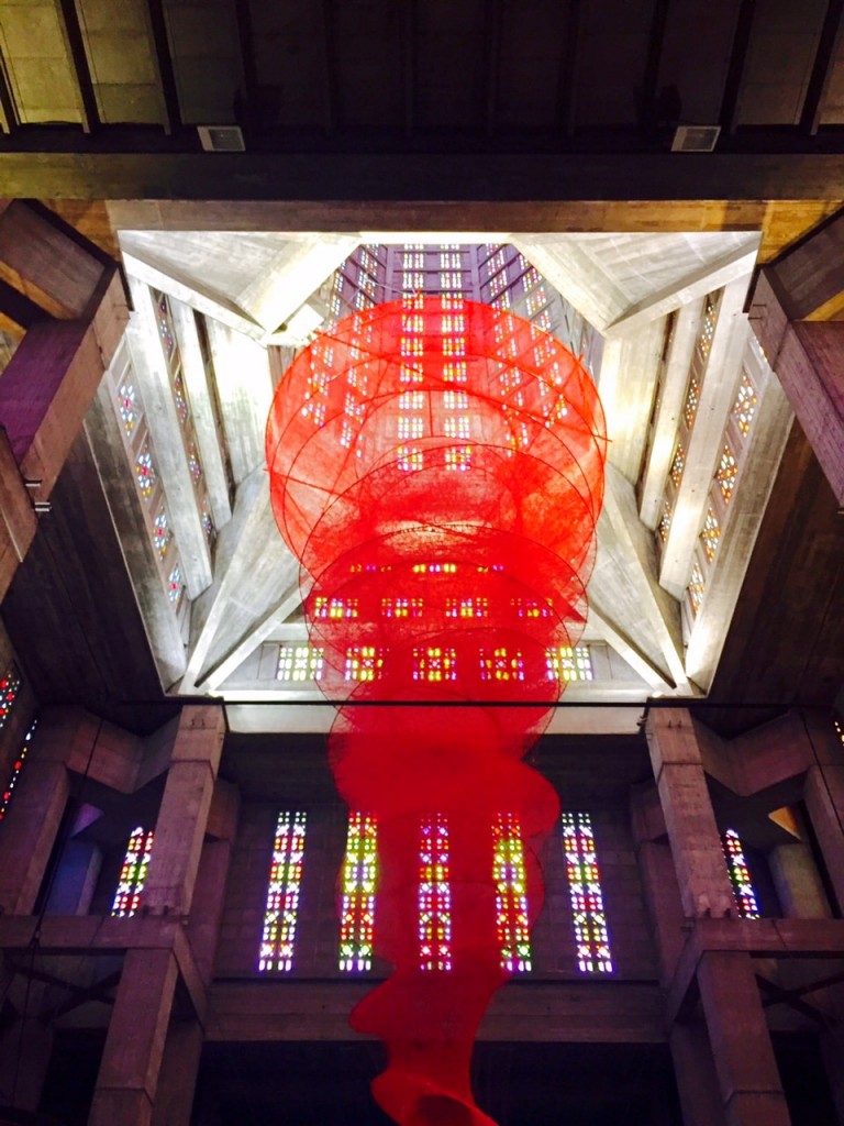 L’hypnotisant tourbillon rouge, constitué de milliers de fils de laine , de Chiharu Shiota s’élevant au dessus de l’autel de l’église Saint Joseph, autre lieu phare du Havre dont il sera question un peu plus loin dans l’article;