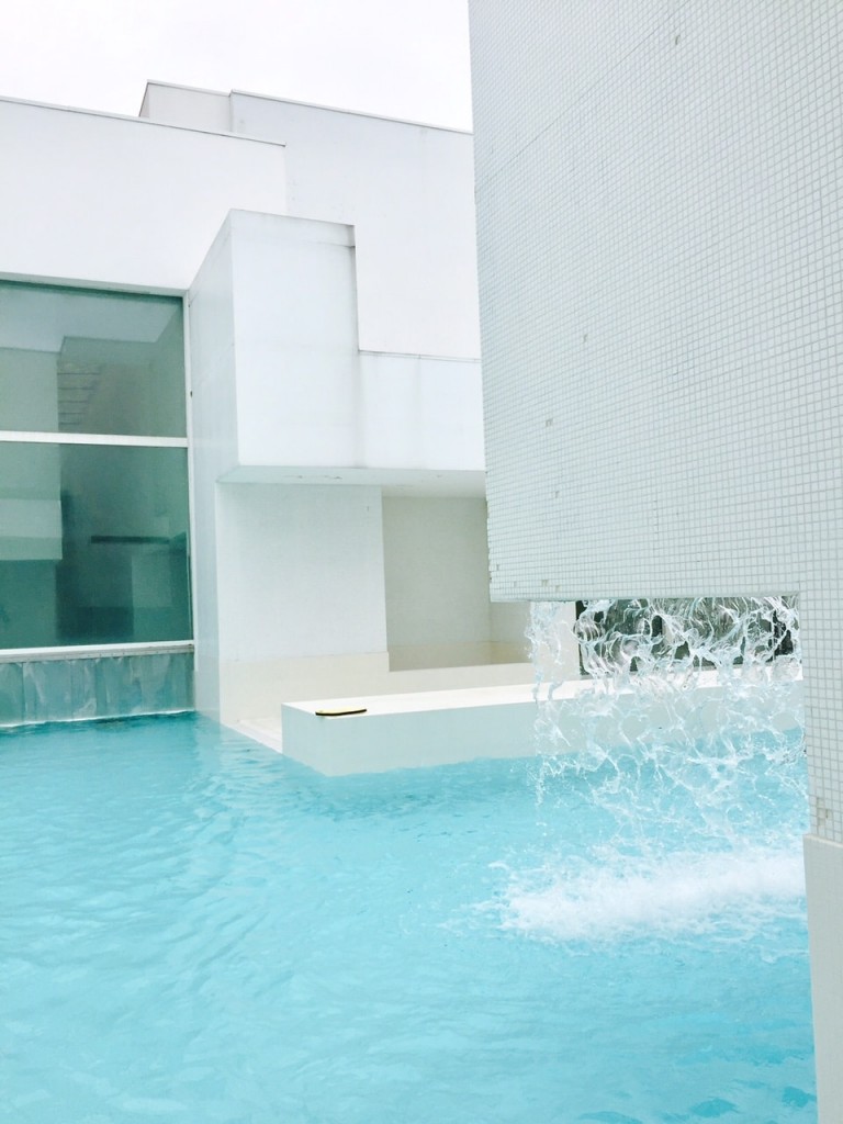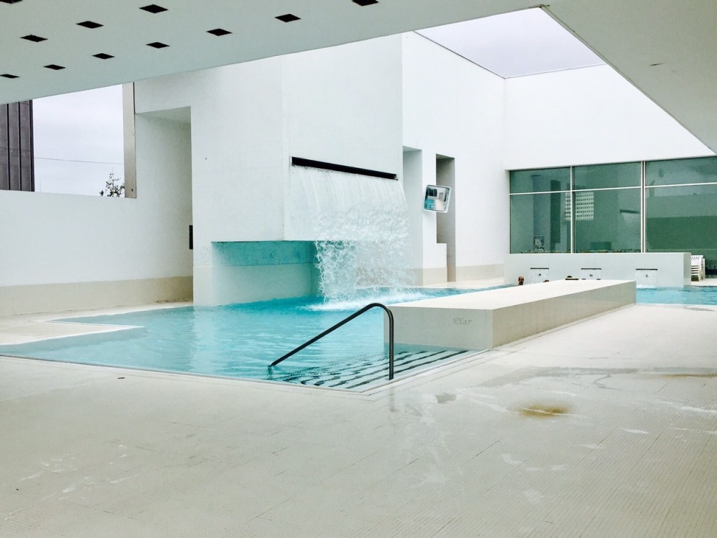 L’architecture, aux lignes épurées, de ce complexe aquatique, privilégiant mosaïques et couleur blanche, est une première source d’émerveillement.