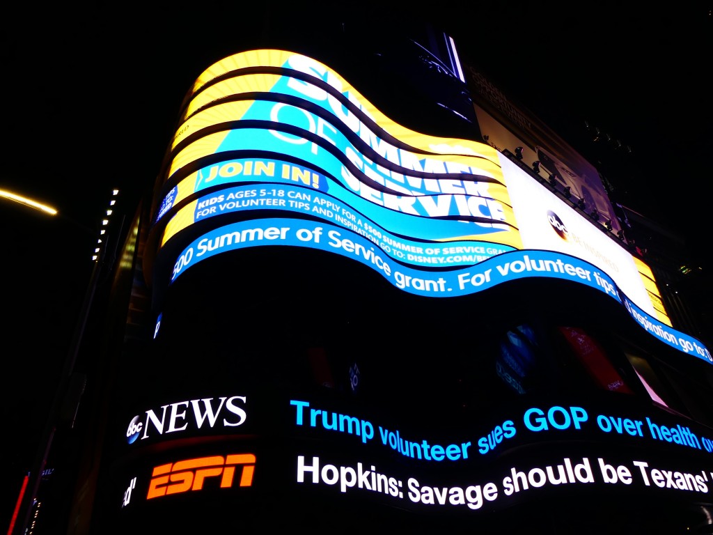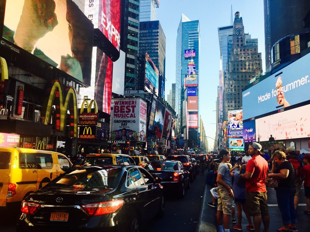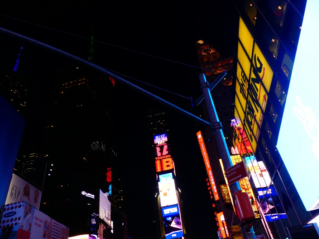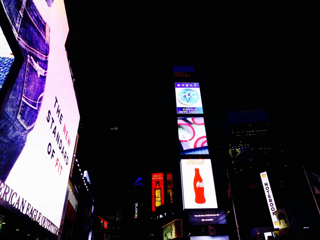 Jouxtant les théâtres où se jouent d’innombrables comédies musicales, la place, jadis siège du renommé quotidien New-York Times, éblouit désormais les visiteurs grâce à  ses gigantesques et lumineux écrans publicitaires.