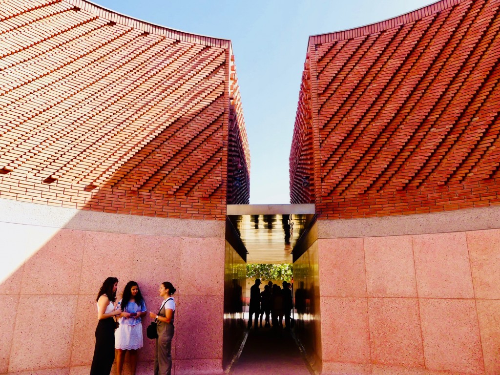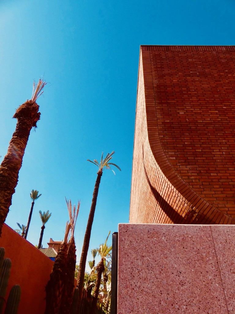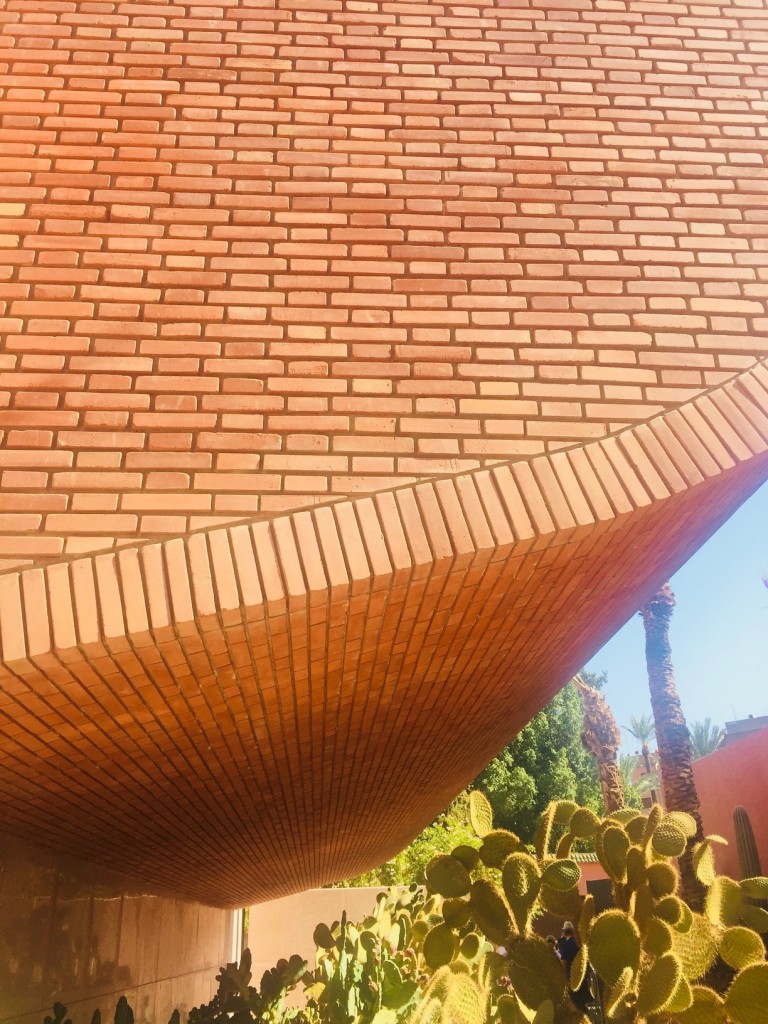 Cubes en briques rouges de Tetouan, béton bouchardé, vitraux colorés et patio circulaire : l’ architecture de l’édifice porte d’ores-et-déjà en elle une incomparable élégance, renvoyant à celle dont Yves Saint Laurent se fit constamment l’héraut,  qui laisse présager toutes les merveilles qu’il renferme.
