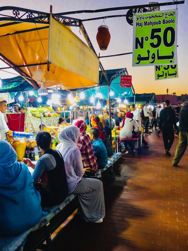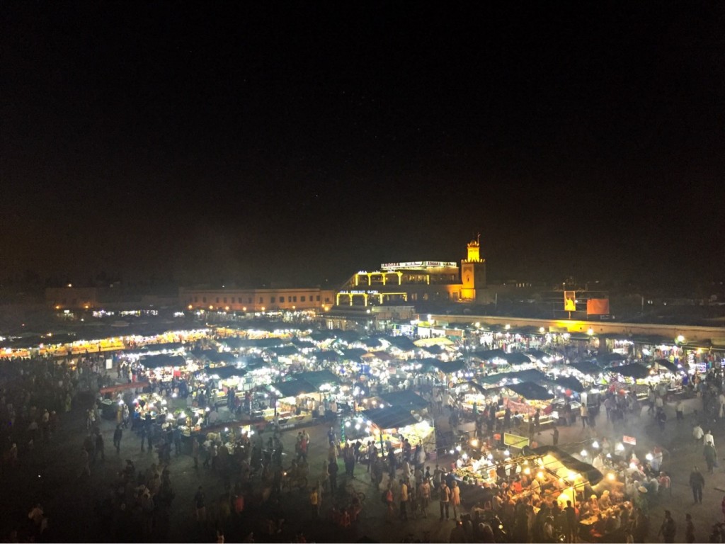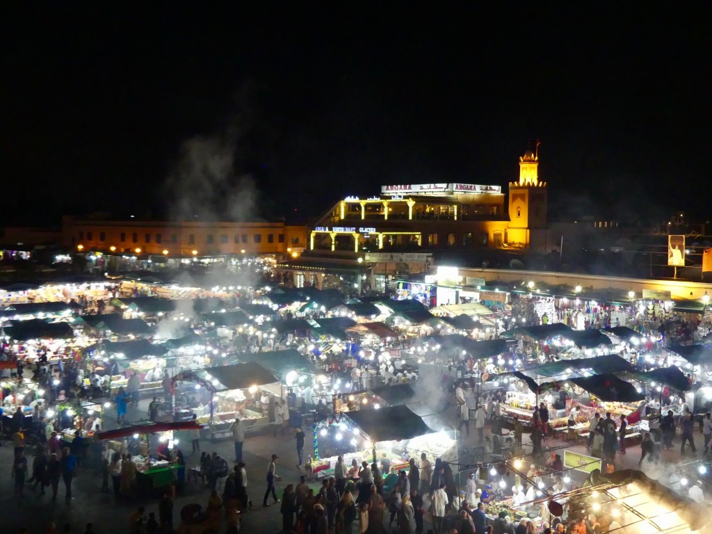 Un inoubliable rendez-vous populaire qui se laisse aussi parfaitement embrasser du regard depuis les terrasses panoramiques des cafés, tels l’Argana ( où fut, en 2011, perpétré un attentat), surplombant la place.