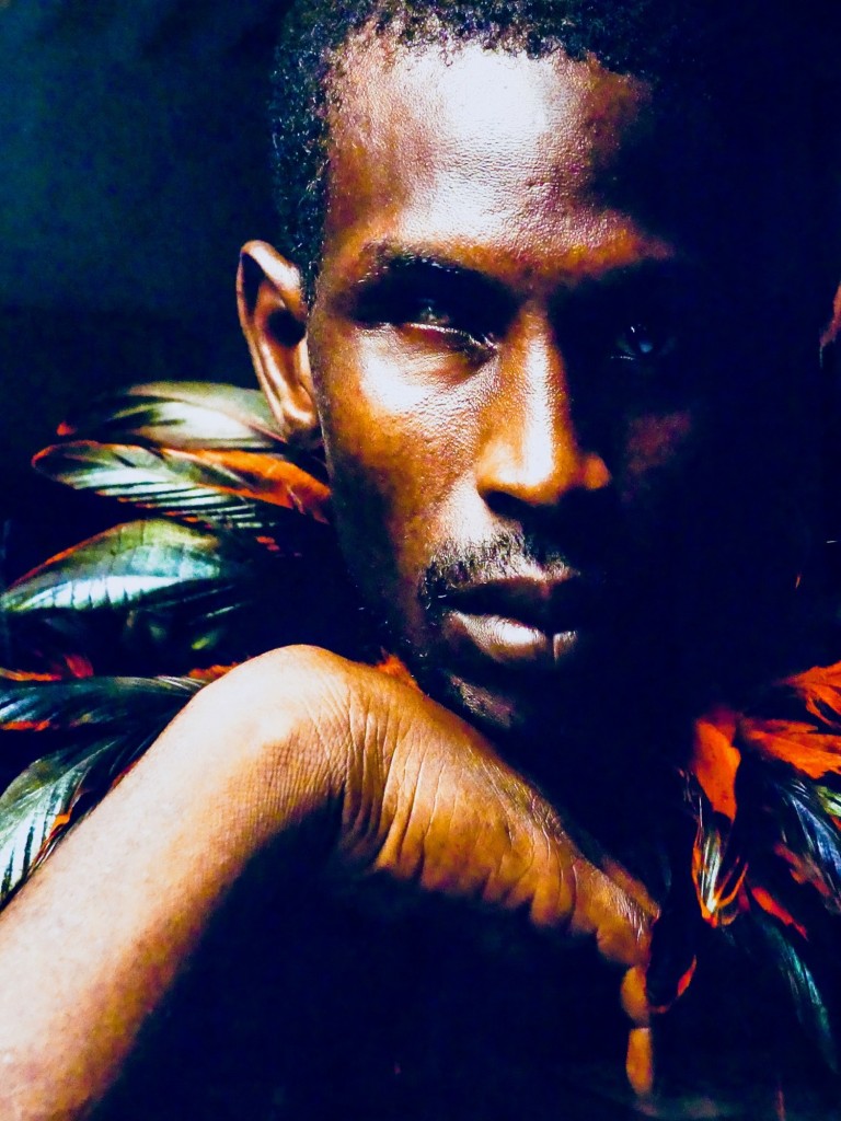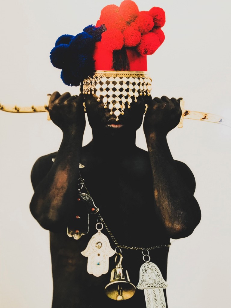 Dans la série photographique Daibi, renvoyant à un Dieu imaginaire, l’artiste se met ainsi en scène portant des attributs (chapeaux berbère ou youruba, couteau) renvoyant à plusieurs cultures.