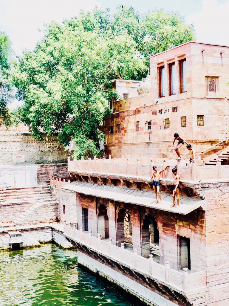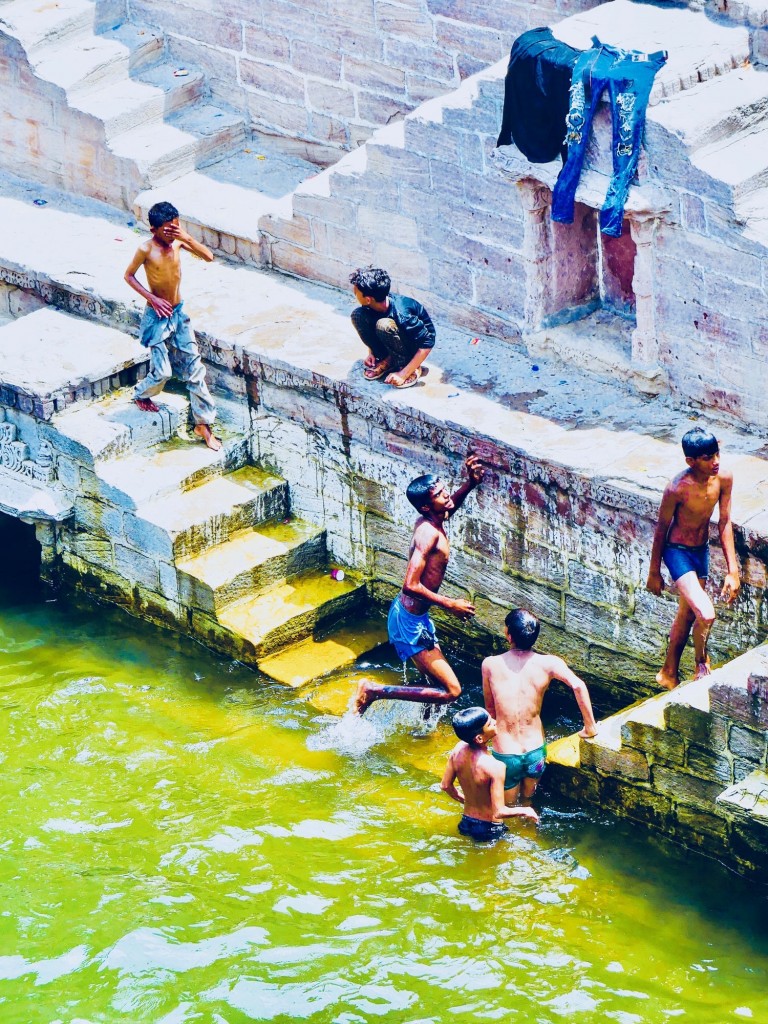 enfants et adolescents profitent de la « piscine » constituée par un ancien puits de Jodhpur