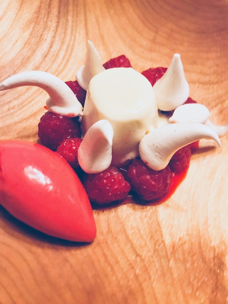 sorbet à la fraise, framboise, meringue, panacottaÂ