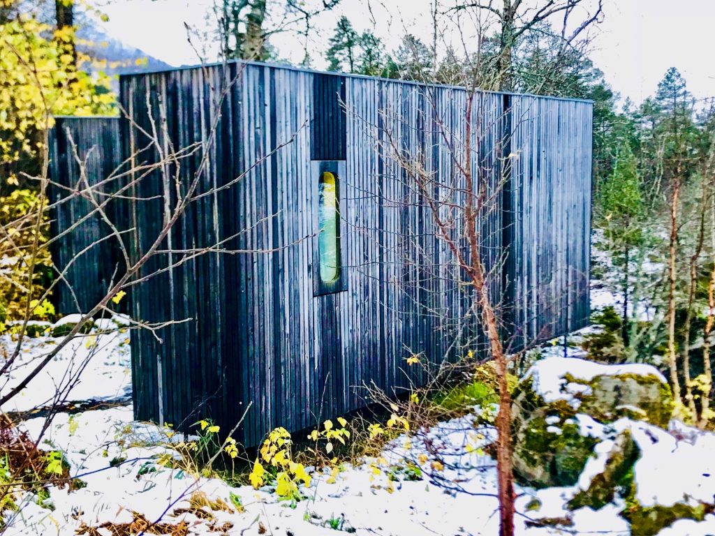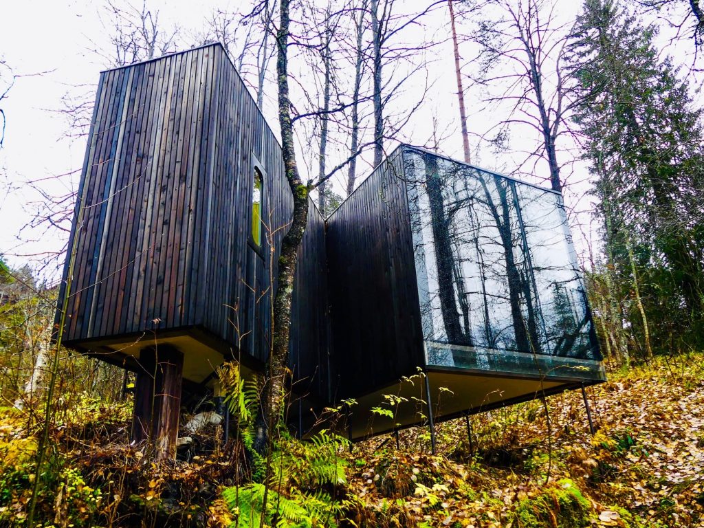 sept cubes, d’une superficie de 30 m2, surgissent ainsi entre arbres et roches.