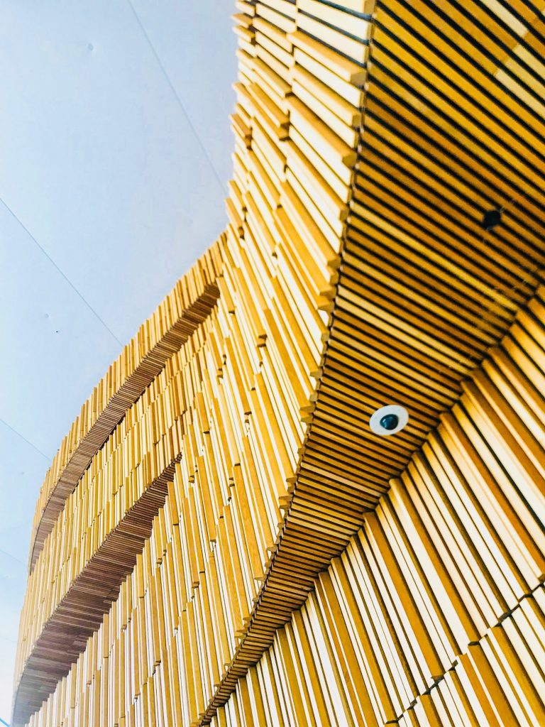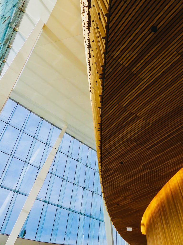 foyer de l’Opéra avec ses immenses baies vitrées et son mur en chêne tout en courbes
