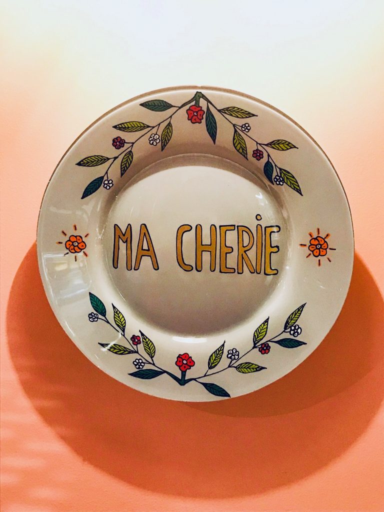 Coussins & couvertures de lit en wax, poupées, photographies vintage, affiches imaginées selon les canons du cinéma Tamoul à partir de portraits figurant dans Portraits of Gare du Nord, chaises en fil de pêche, gravures vintage, valises, plafonds & murs peints de couleurs vives, pieds de lit réalisés à partir de caisses de vin personnalisées, avec humour, du nom de l’ hôtel (Château Terminus Nord, Appellation Saint 25 heures Grand Cru Classé, 2018, mise en bouteille au Château Paris)