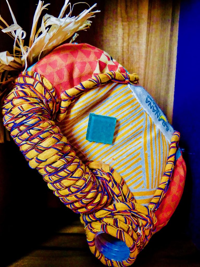 masques réalisés à partir de bidons d’essence de la marque & Banana Cape Town qui rappellent l’oeuvre de l’artiste béninois Romuald Hazoumé