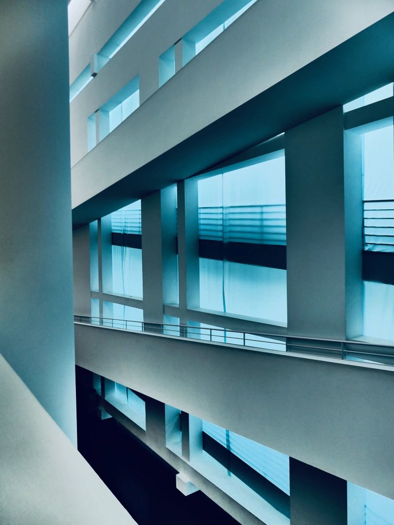 Alternance de lignes courbes et droites permettant au bâtiment, grâce aux nombreuses baies vitrées devenues sa signature, d’être baigné d’une lumière irradiante.