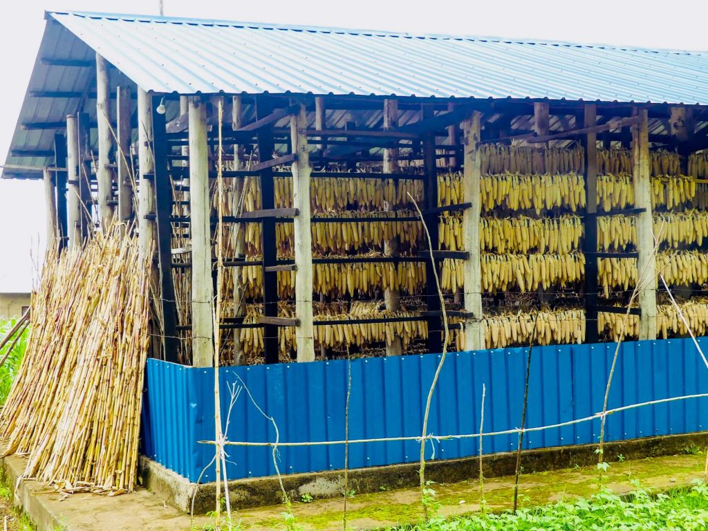 mais mis à sécher dans des hangars