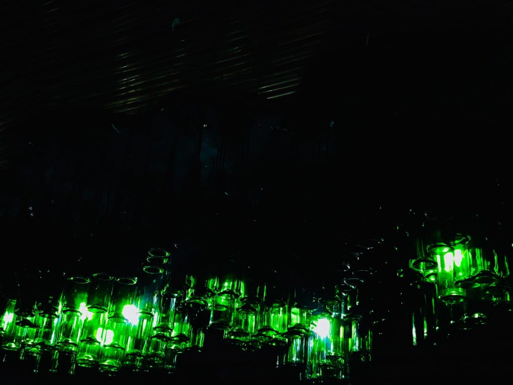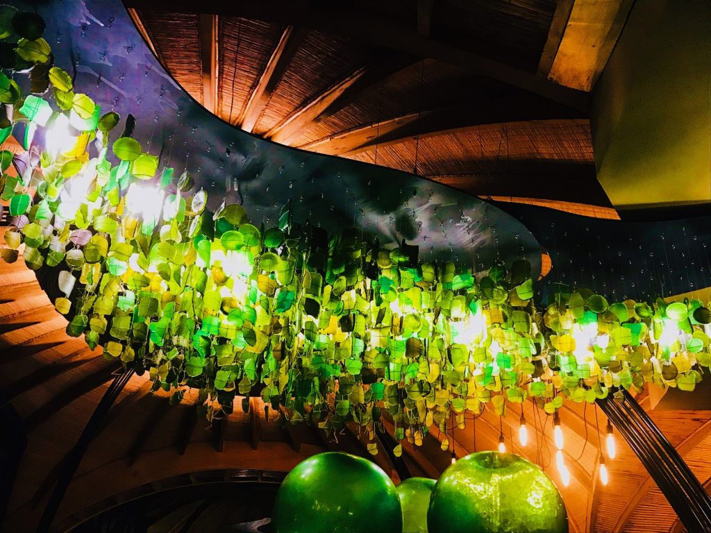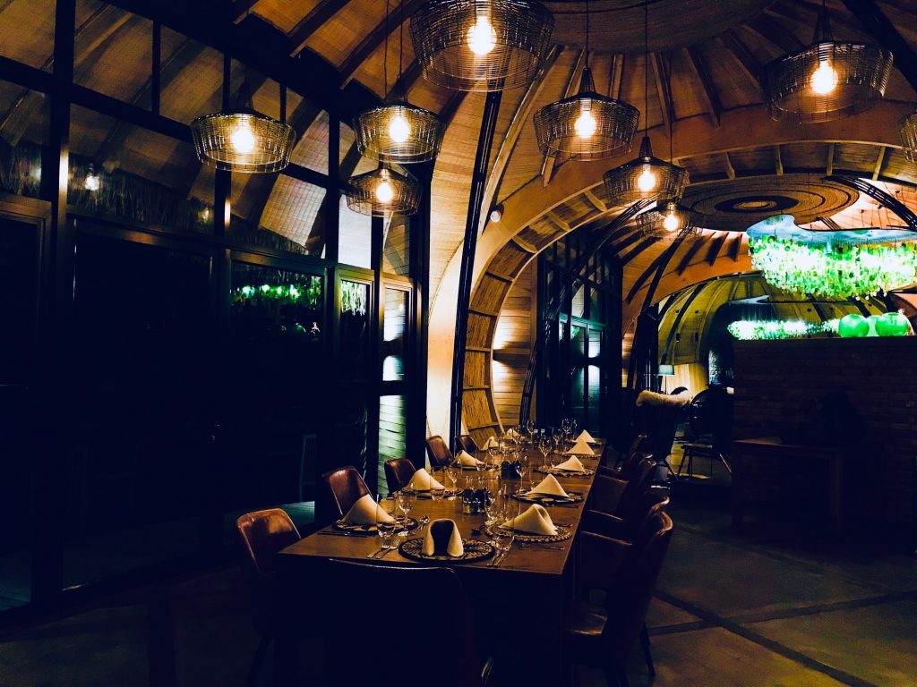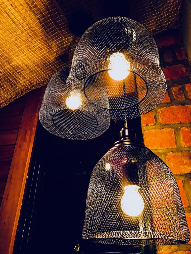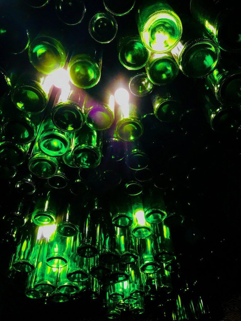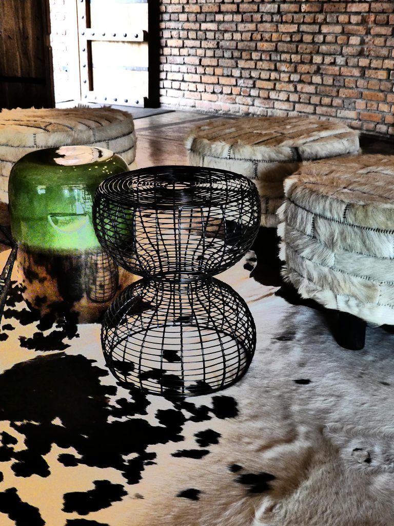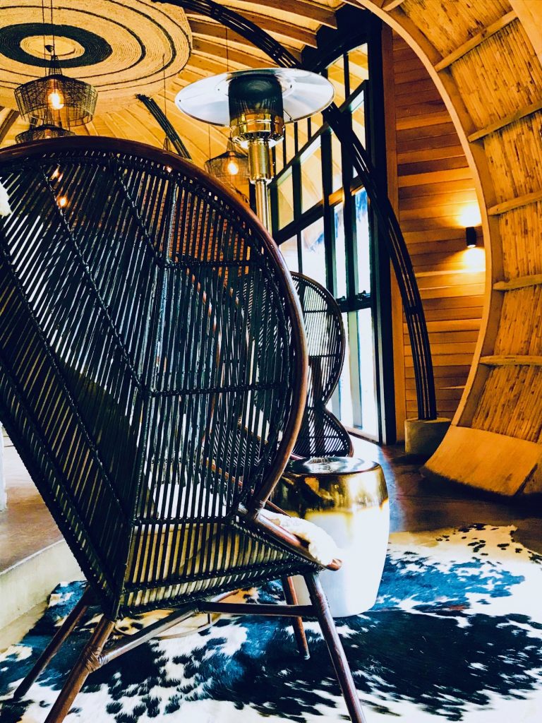 Dont les fauteuils, en cuir et rotin, ainsi que les insolites chandeliers réalisés à partir de bouteilles, en verre, recyclées attirent inéluctablement les regards.