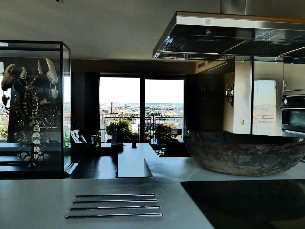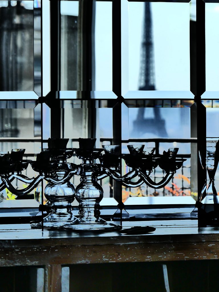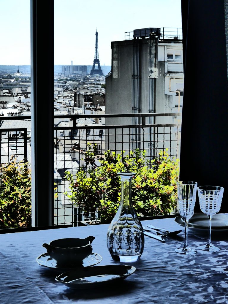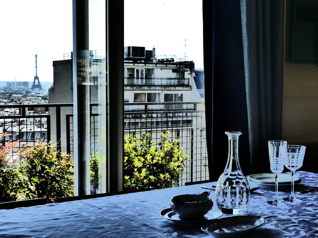 Golden Hour, vue sur la Tour Eiffel depuis la salle à manger du penthouse de l’Hotel Chat Noir