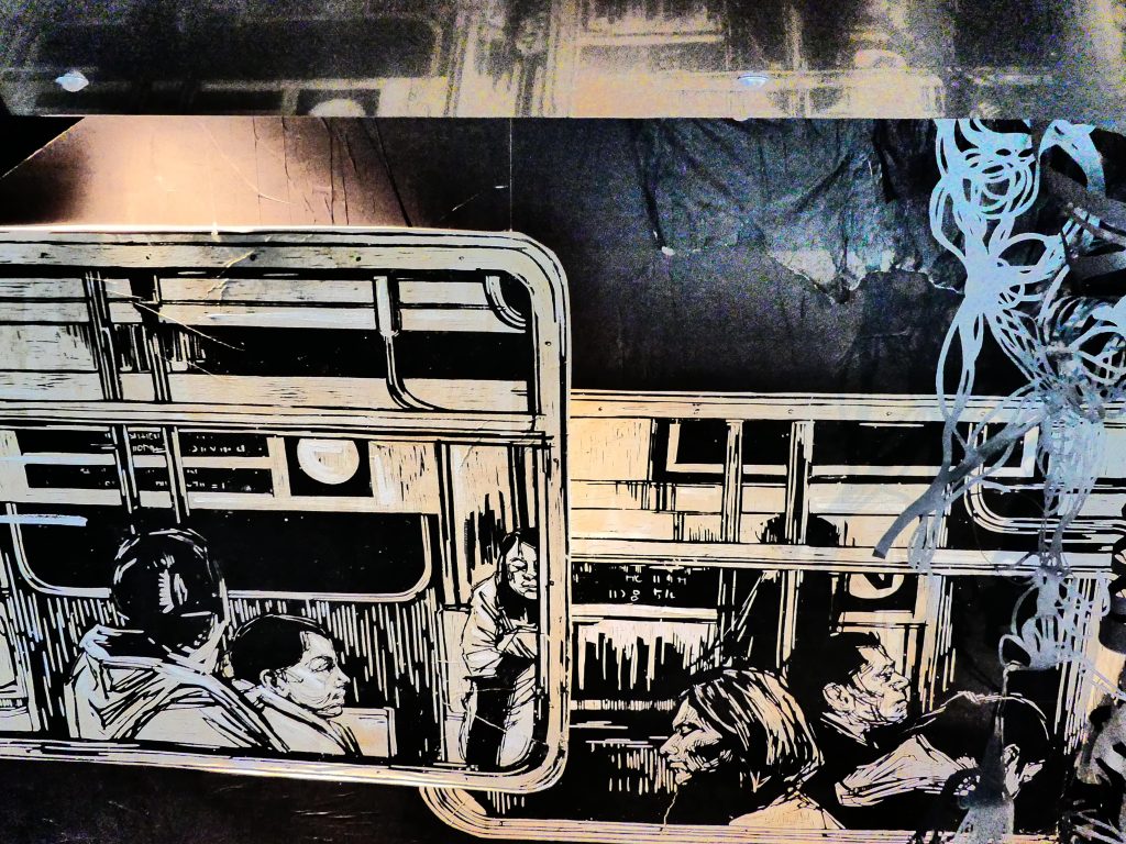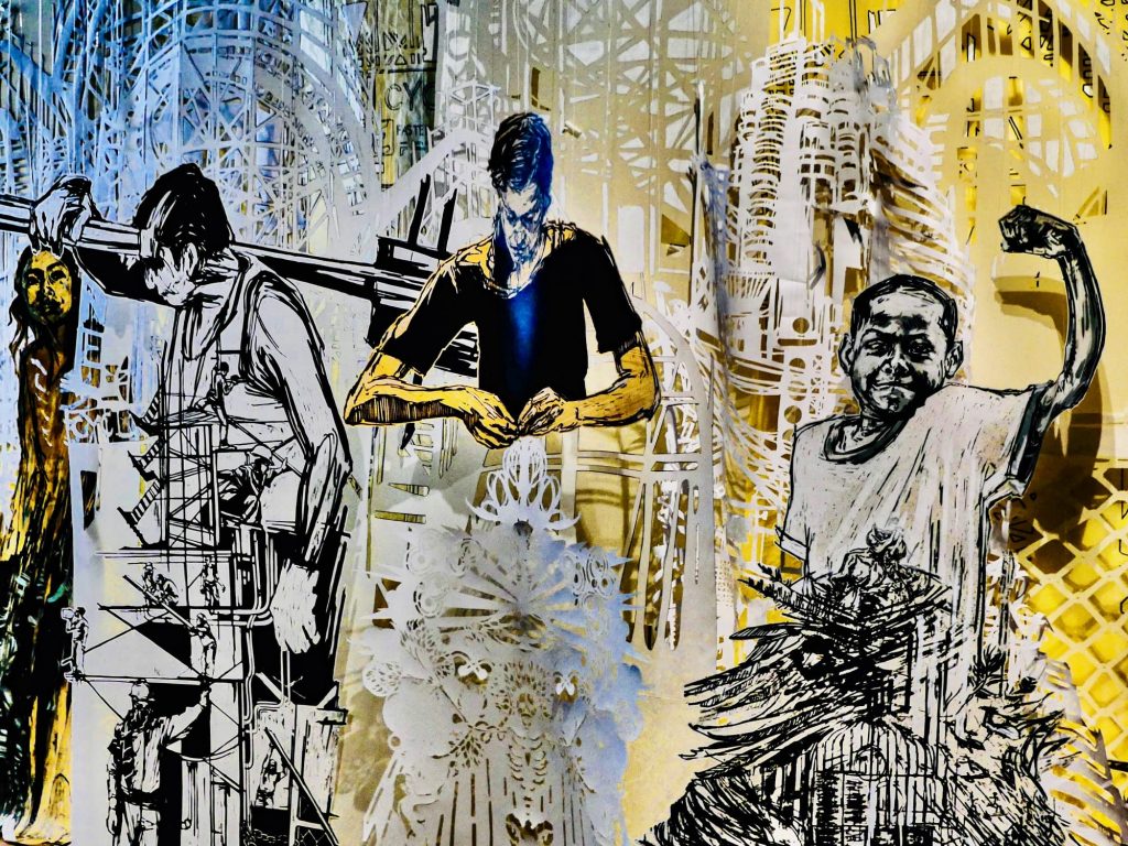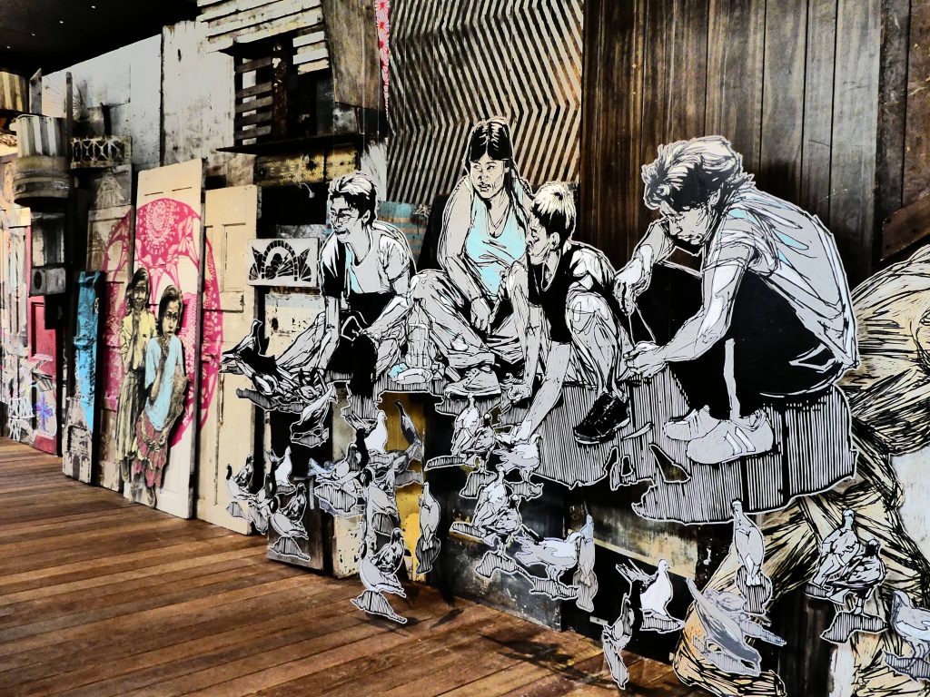 Telles le Mima Museum de Bruxelles, en 2016, avec « City of Lights » et le Musée parisien de l’Homme où Swoon, dans le cadre du 70 ème anniversaire de la Déclaration des Droits de l’Homme, a choisi, en 2019, d’illustrer l’article 23, relatif au droit du travail, dudit texte .