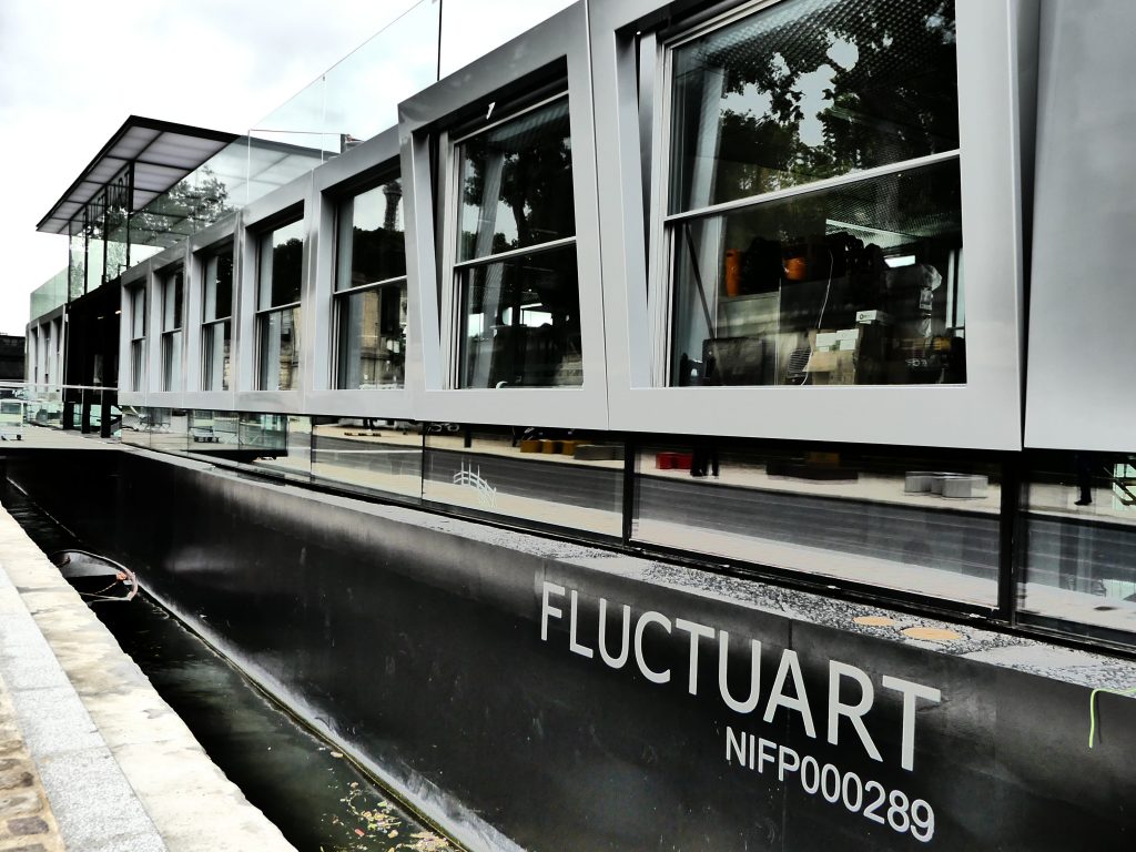 Prenant ancrage, pour 20 ans, au cÅ“ur d’un bâtiment flottant de 1000 m2, baptisé Fluctuart, amarré, Port du Gros Caillou, sous le pont des Invalides.