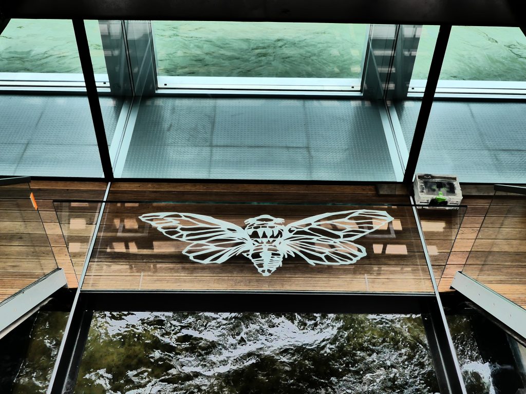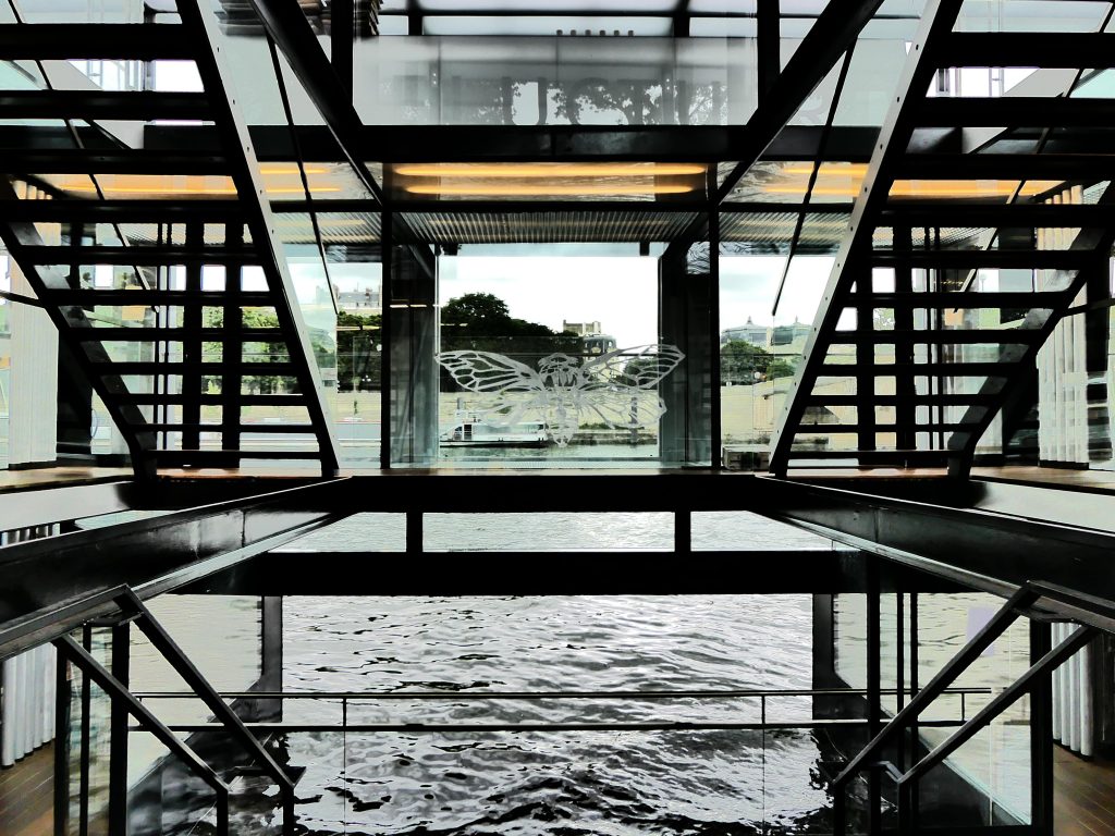 Le jeu de transparence qui en résulte permet donc, tout en contemplant les Å“uvres d’art présentées, de constamment y embrasser du regard, et ce peu importe l’un des trois niveaux de Fluctuart où l’on se trouve, la Seine, ses ponts et quelques monuments parisiens .