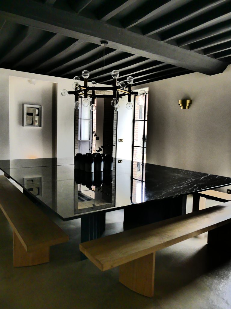 table à manger en marbre noir & bancs en chêne, réalisés sur mesure