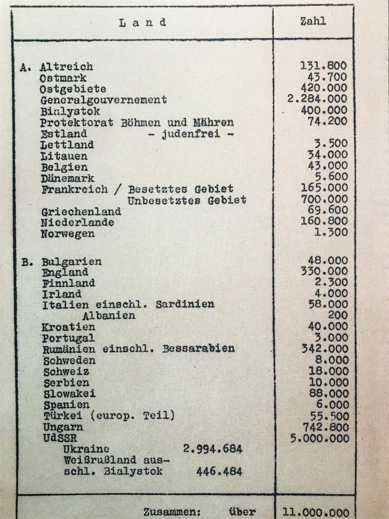 minute de la conférence de Wannsee, indiquant le nombre de Juifs à exterminer dans chaque pays européen, où fut décrétée la Solution Finale