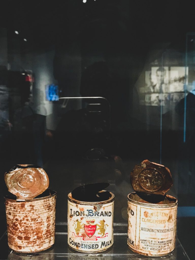 boites de lait condensé trouvées, en janvier 45, par les déportés, après le départ des troupes SS du camp, dans les entrepôts nazis et qu’ils partagèrent