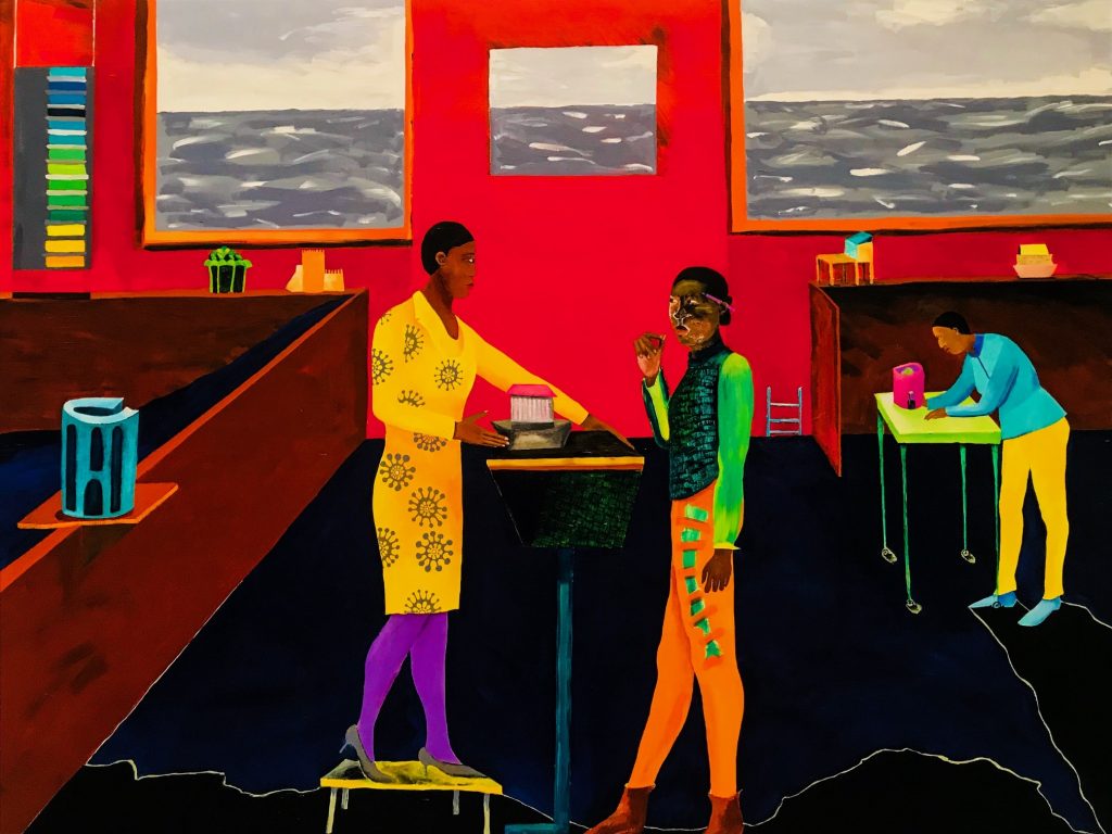 aux lumineux dessins, toiles et sculptures, donnant de la visibilité aux gens de couleur et s’interrogeant également sur l’héritage colonial anglais encore perceptible dans l’art et l’architecture, de l’artiste anglo-tanzanienne Lubaina Himid,