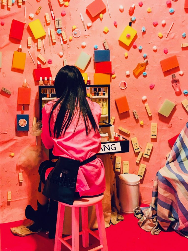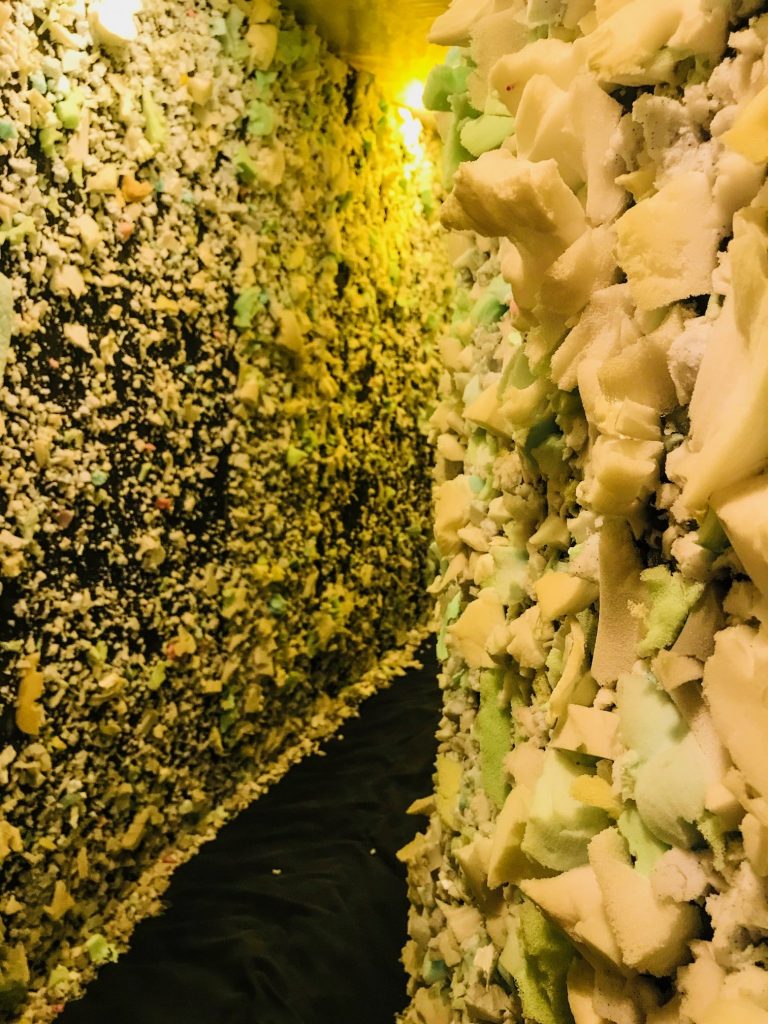 Proposant une expérience immersive par moments régressives, cet étonnant labyrinthe voit se succéder chambre à coucher accueillant un couple marié, salon de maquillage, salles aux multiples miroirs cachée dans un réfrigérateur, surfaces molles