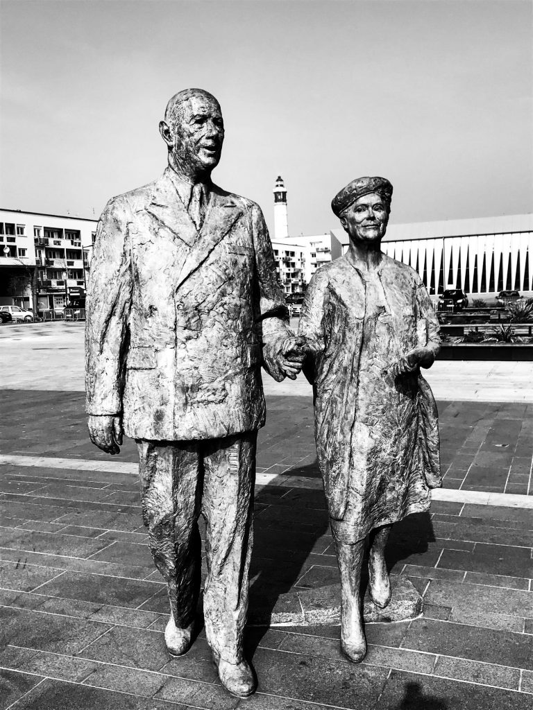C’est ensuite à un légendaire couple présidentiel français, dont le nom est assurément indissociable de la destinée hexagonale, que les statues, conçues par Elisabeth Cibot et installées place d’Armes, rendent hommage : Charles et Yvonne De Gaulle.