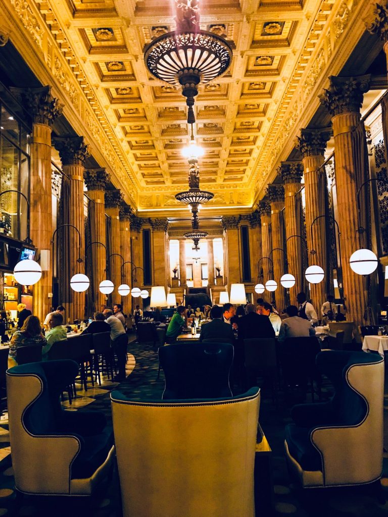 Aménagée, en 2017, dans une ancienne banque, cette table d’exception éblouit tout d’abord par la majesté de son cadre, entre impressionnants escaliers, inimaginable hauteur sous plafond, nombreuses colonnes en marbres structurant l’espace, superbes chandeliers, multiples alcôves romantiques et coffres-forts désormais convertis en salons privés à couper le souffle.