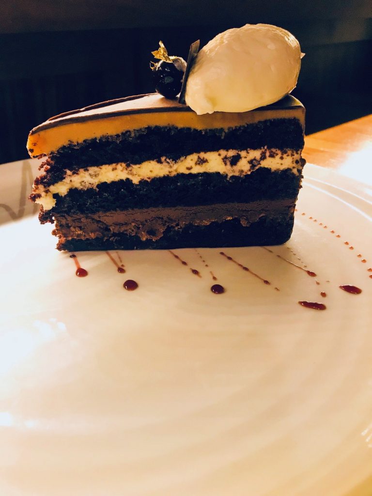 Gardez néanmoins un peu de place pour le succulent dessert qu’est le gâteau au trois chocolats.