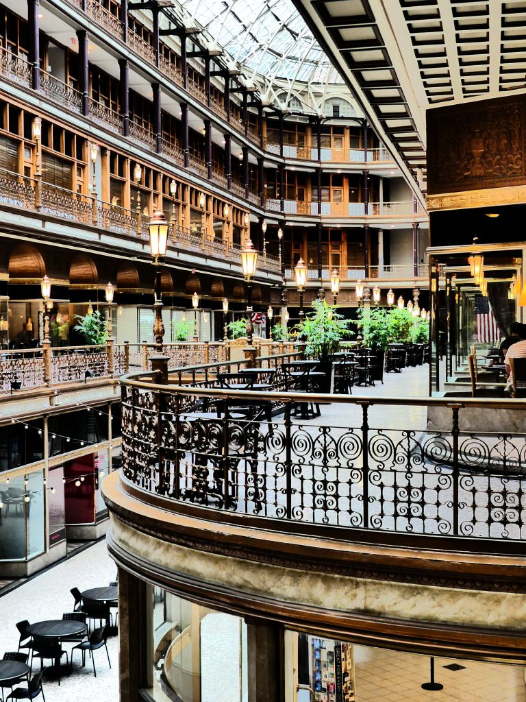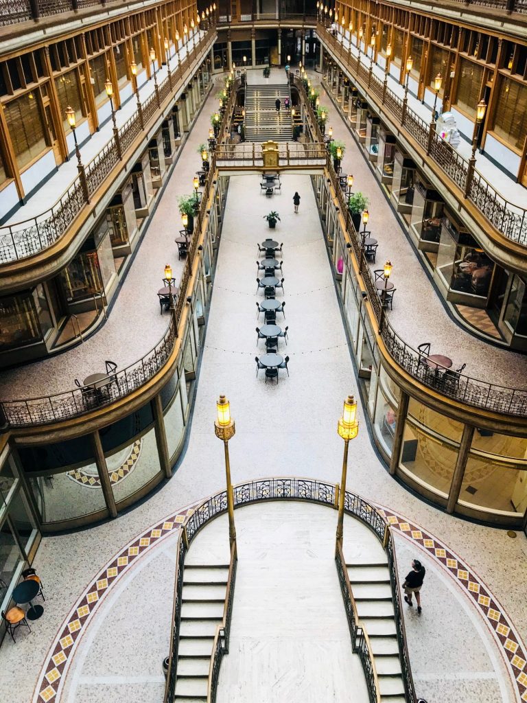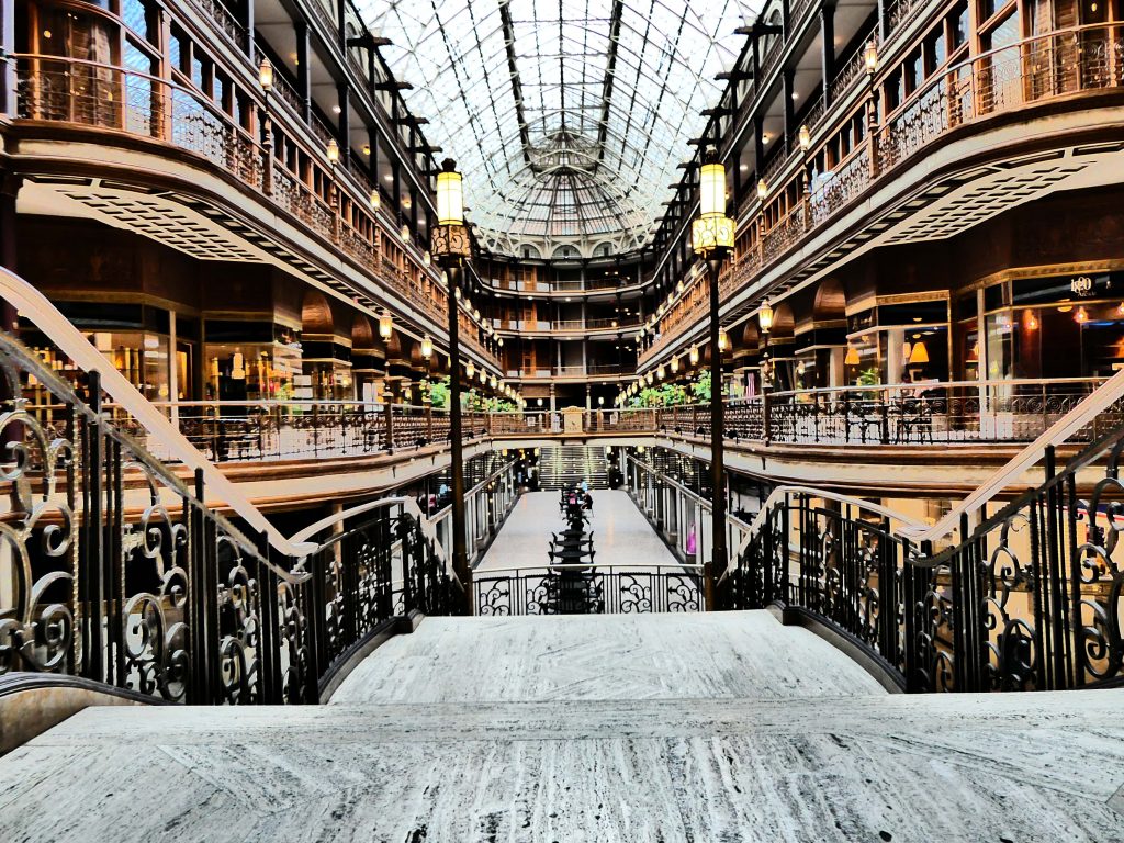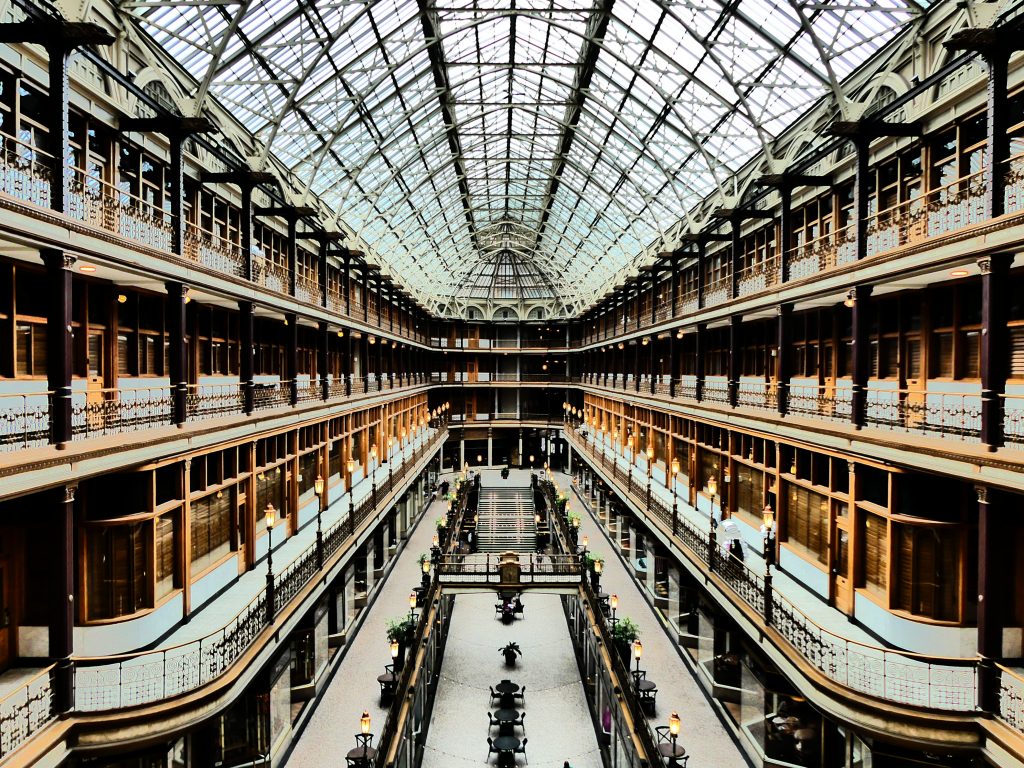 Première galerie marchande couverte inaugurée, à la fin du 19 eme siècle, aux Etats-Unis, The Arcade, indéniable chef-d’oeuvre de briques, verre et métal, n’a rien perdu ni de sa superbe ni de sa vocation commerciale.