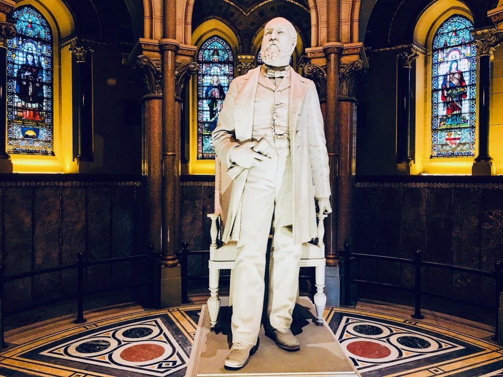 outre un dôme central en dessous duquel a été installée la sculpture de James Garfield réalisée, en marbre de Carrare, par Alexander Boyle.
