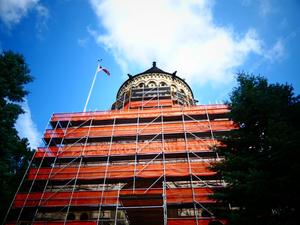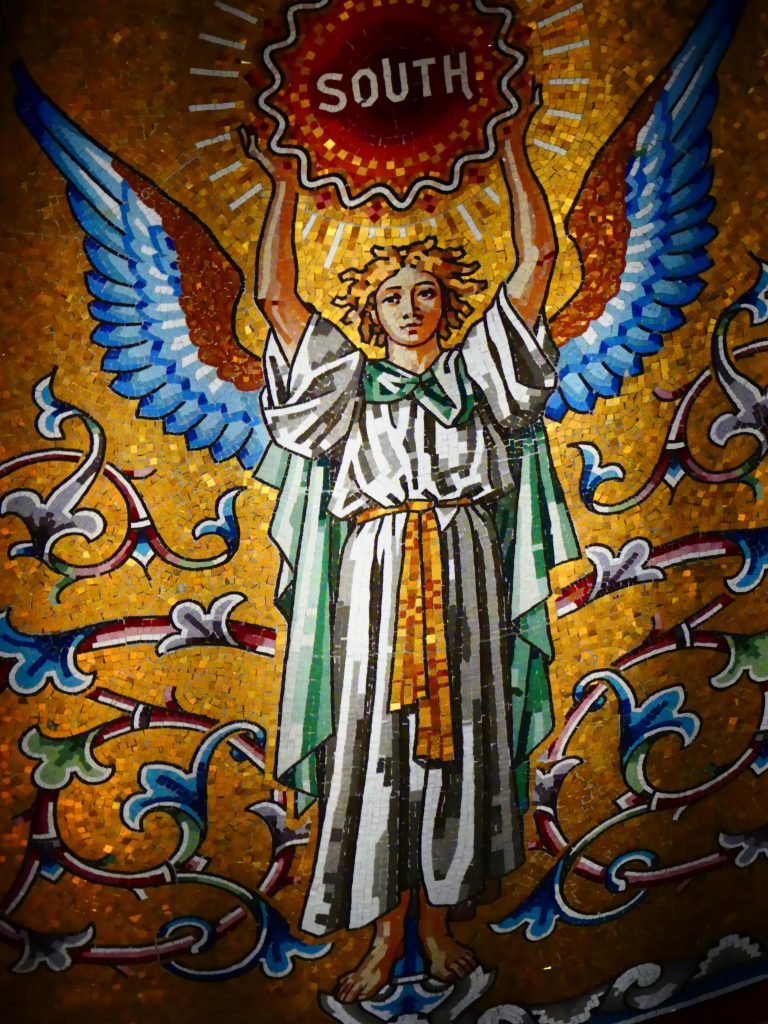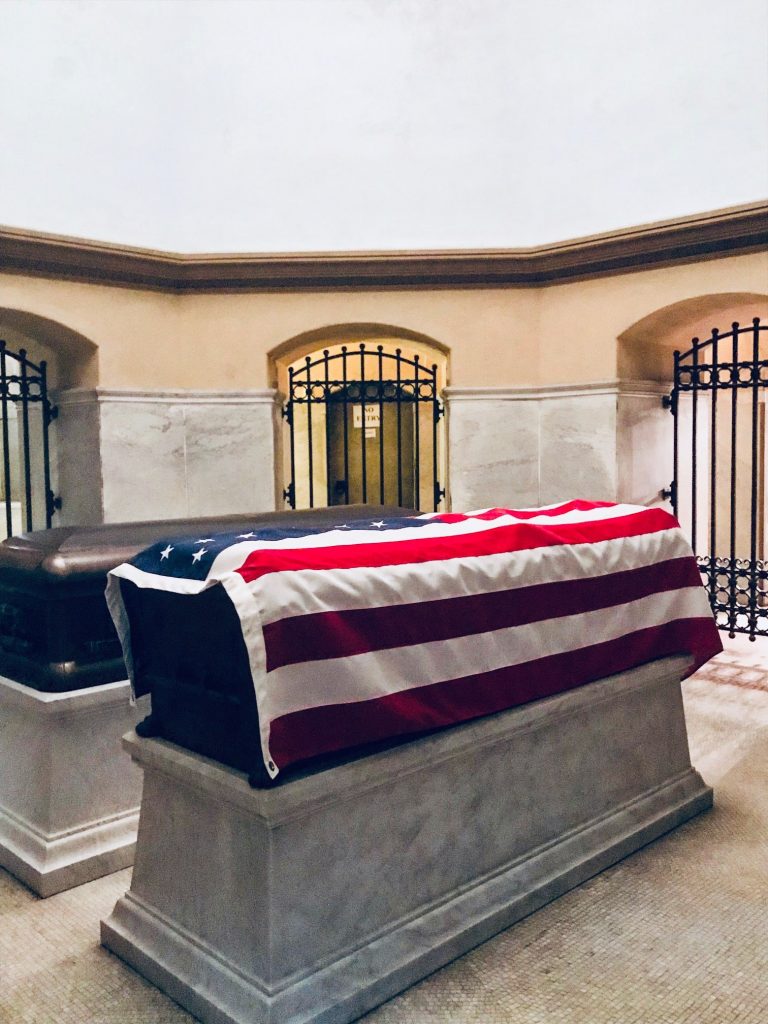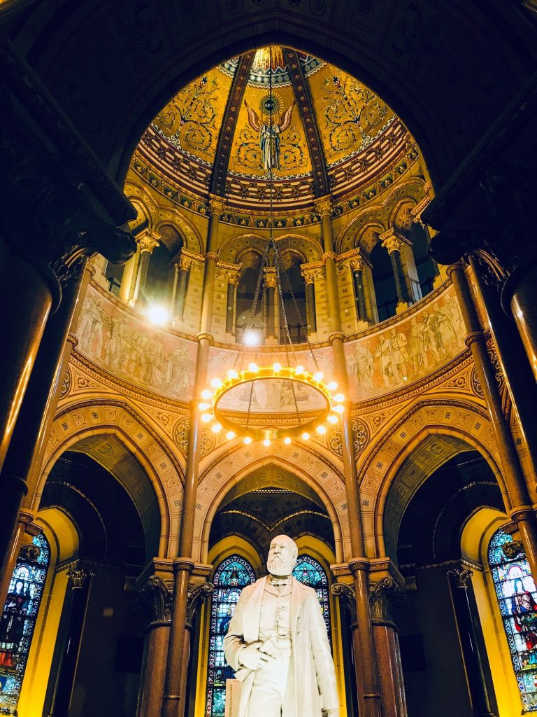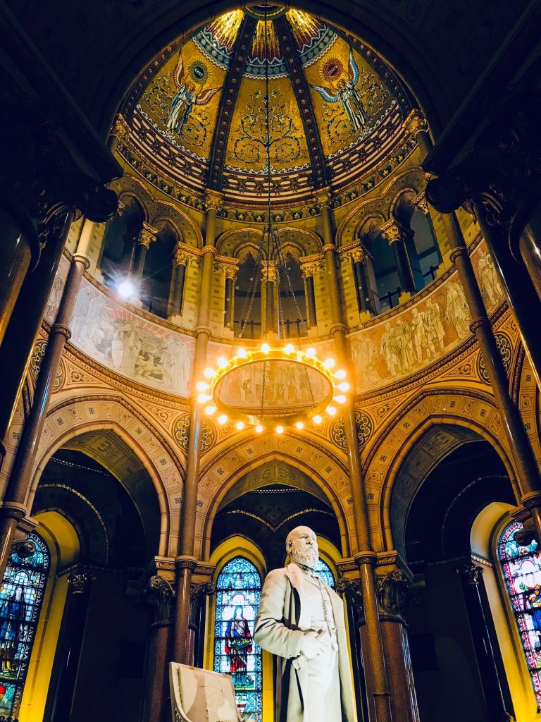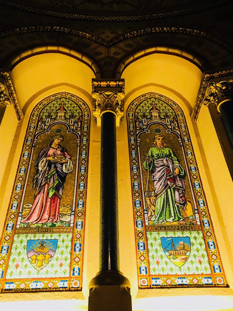 Si les travaux en cours cet été ne laissait que partiellement deviner la beauté des bas-reliefs gravés sur son imposante façade, l’intérieur révèle quant à lui d’éblouissants vitraux et mosaïques, évoquant la vie du disparu ou représentant, au coté de l’Ohio, les 13 états fondateurs du pays