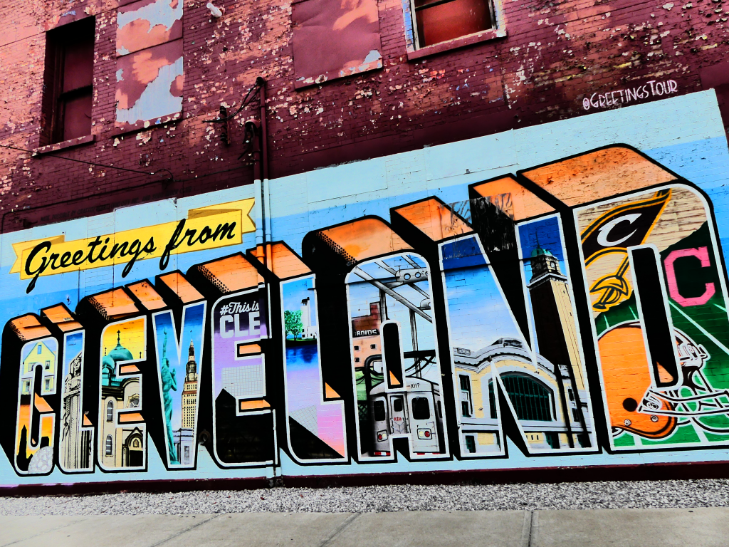 Impossible de débuter cette exploration urbaine sans faire une halte devant l’iconique Greetings from Cleveland,