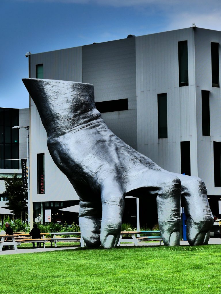 Étonnante sculpture, réalisée par Tony Tasset à partir de la main de son épouse, jouxtant le Musée d’Art Contemporain ( fermé, pour cause de préparation des nouvelles expositions, lors de mon passage cet été).